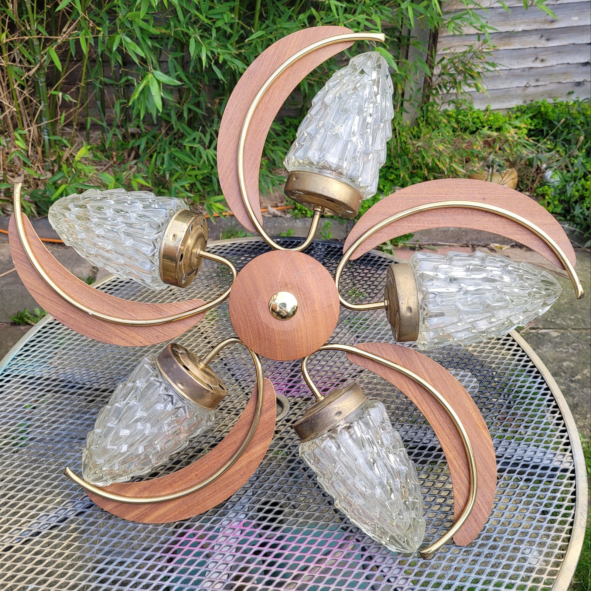 MCM atomic-style 5-arm teak & glass light fixture