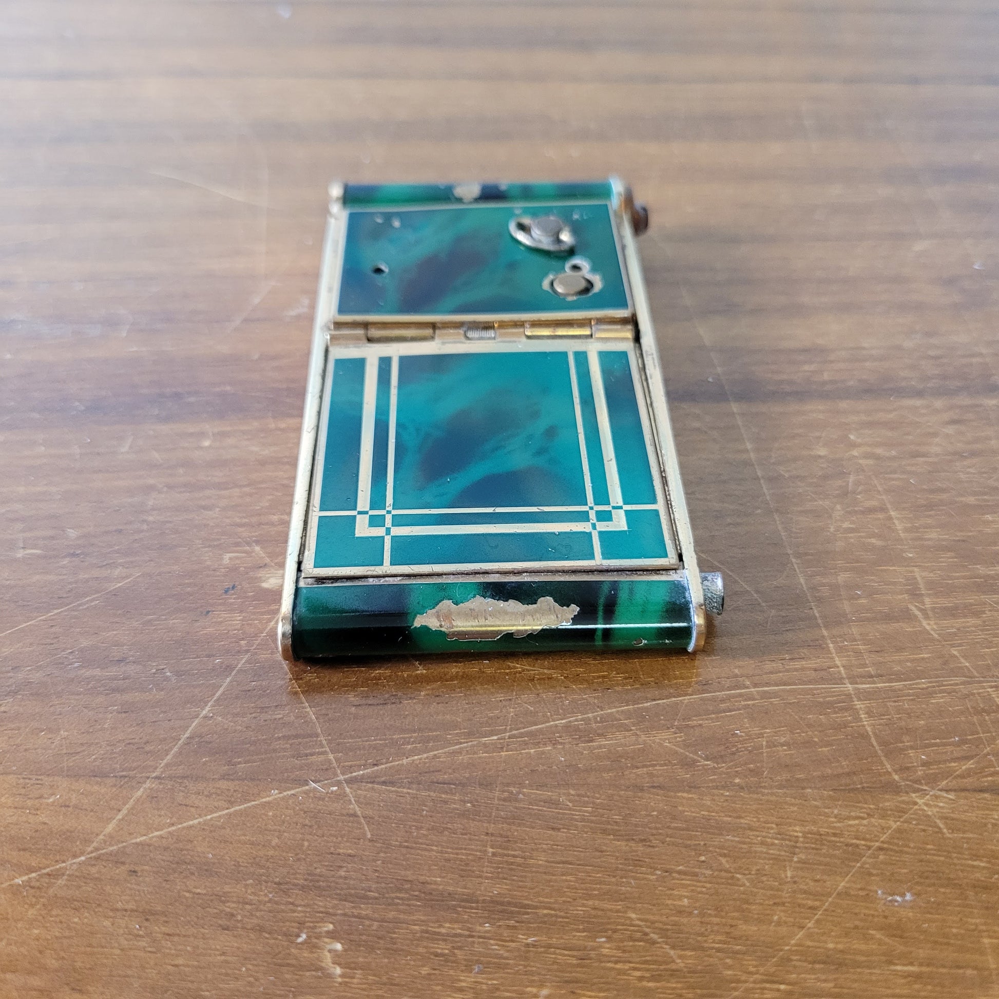 This 1930s French marbled green and gold-tone compact is a beautiful vintage collectible, measuring 9.5cm long and 5cm high. Although the musical feature no longer works and a few fittings are absent, its exquisite marbled pattern and gold-tone details create an elegant appeal. Perfect for collectors or enthusiasts of antique charm, it is an excellent piece for display or restoration by those skilled in vintage compacts.