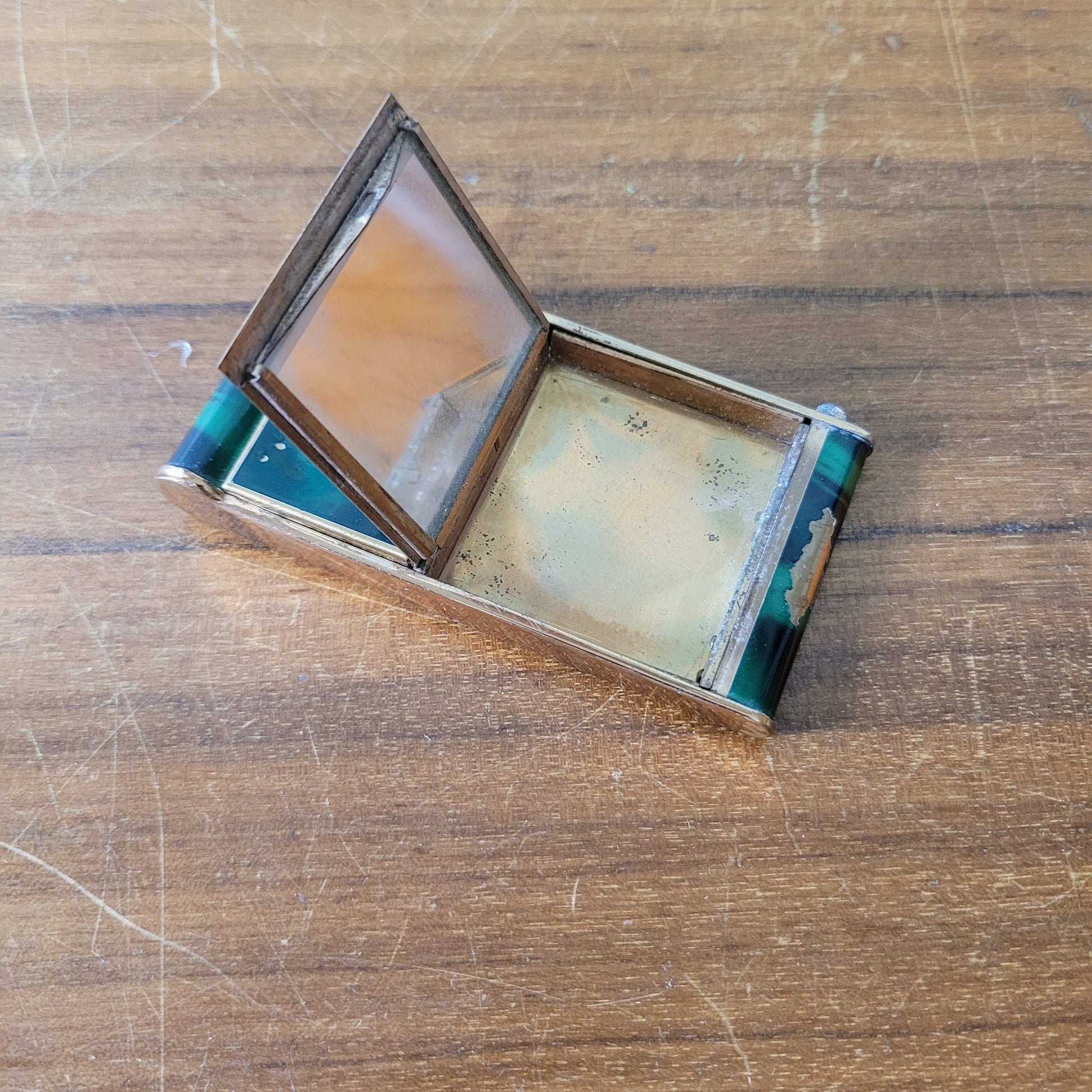 1930s French marbled green & gold-tone musical compact