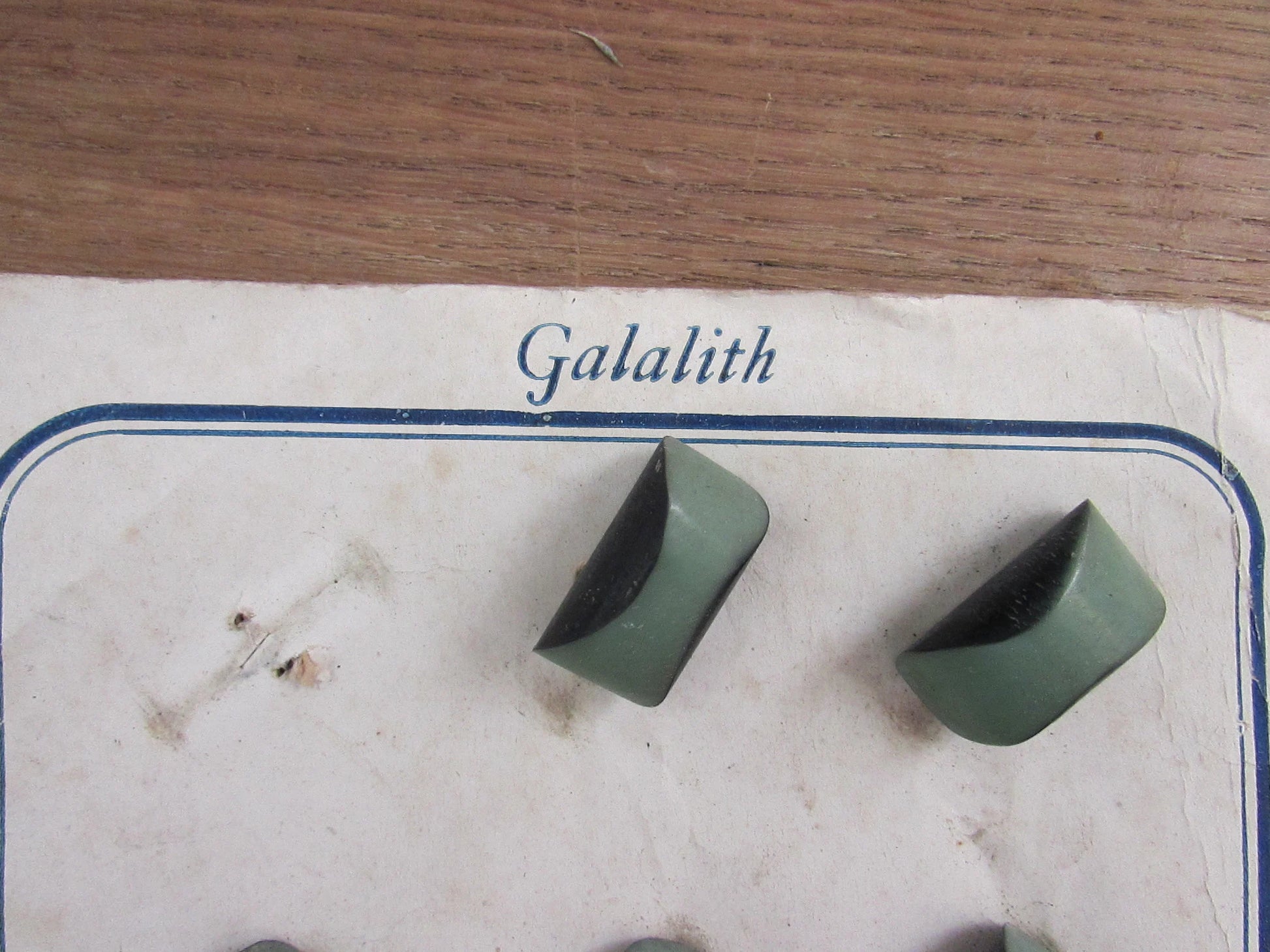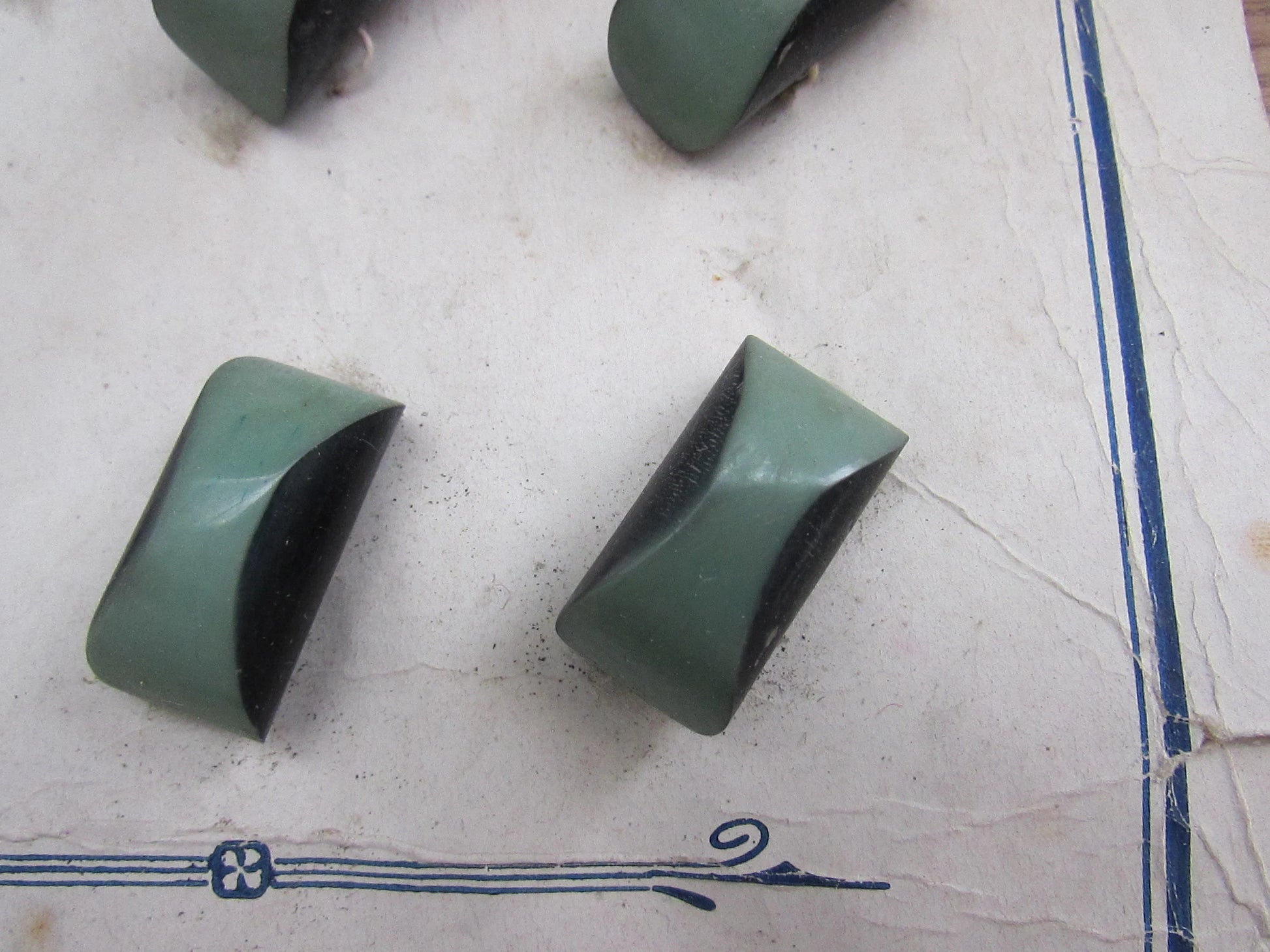 1930s Galalith carded two-tone green domed oblong buttons x11