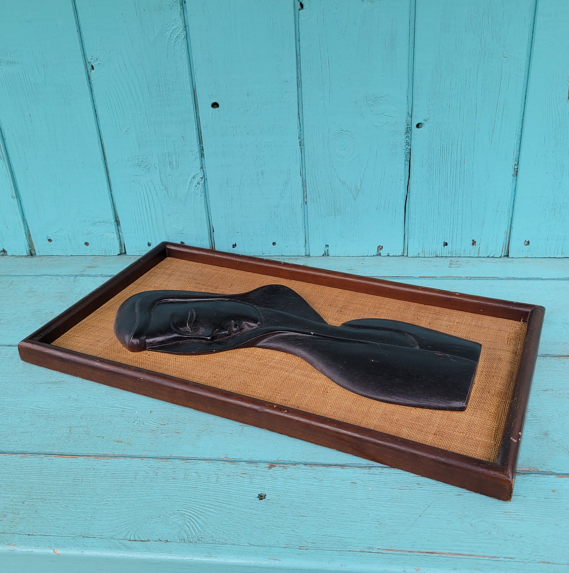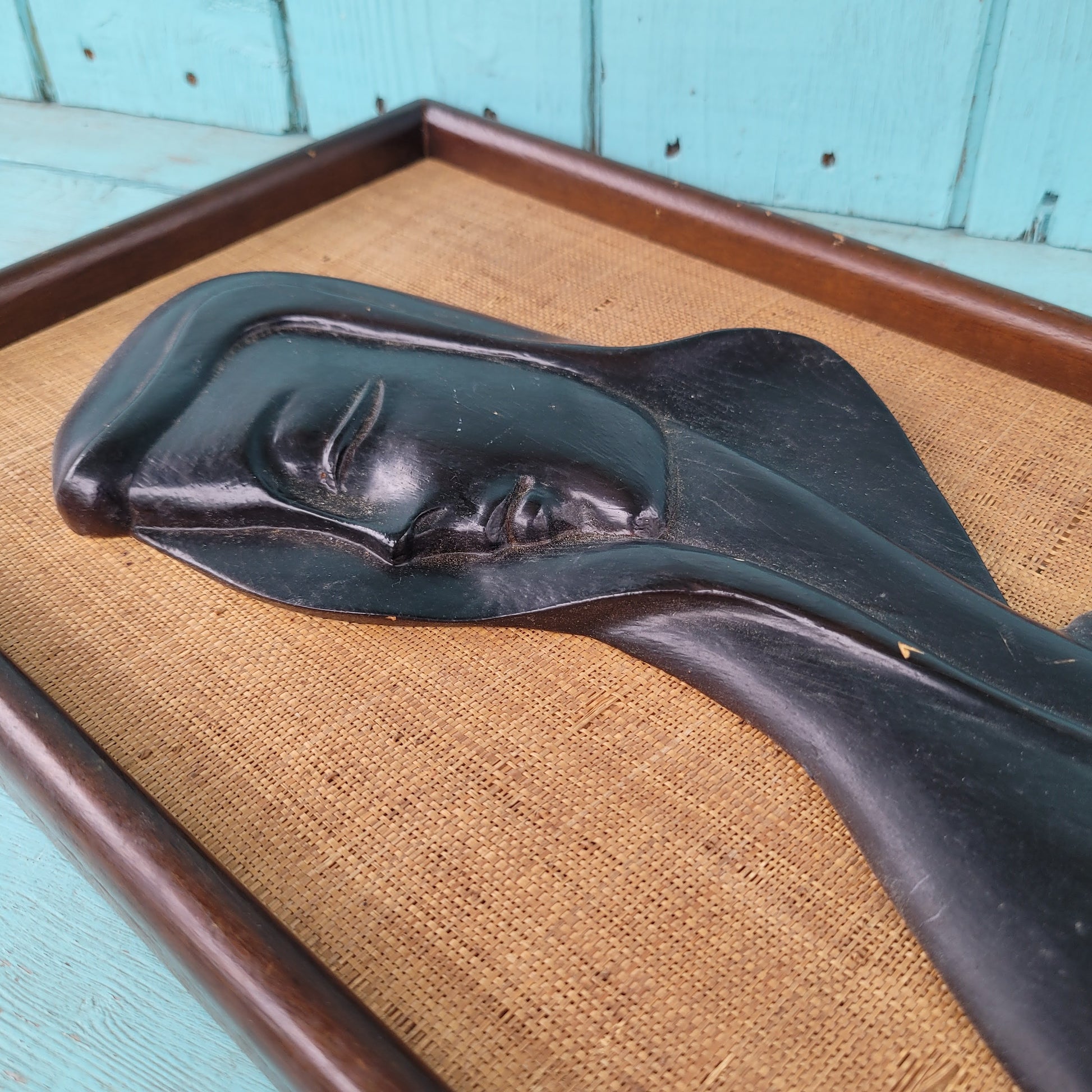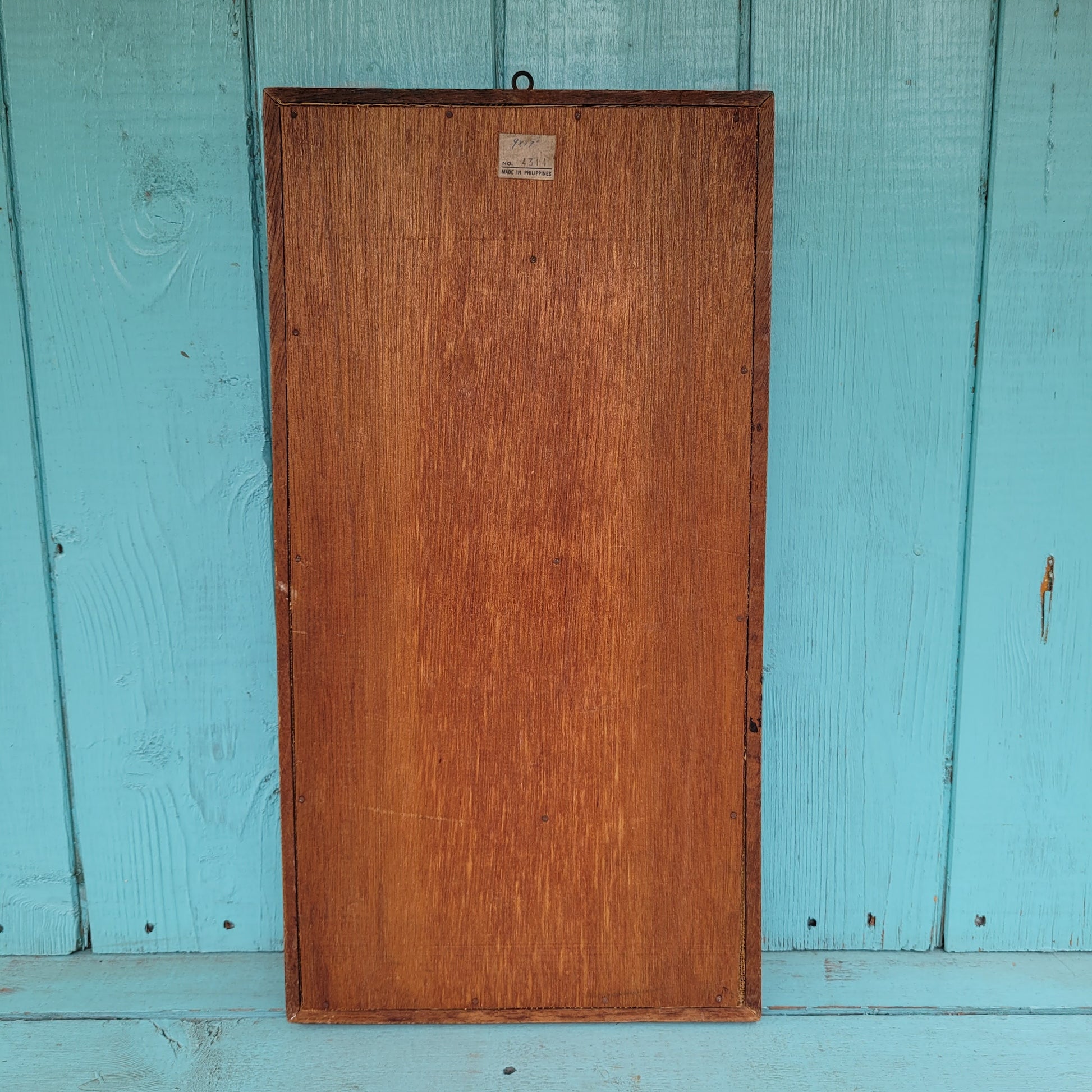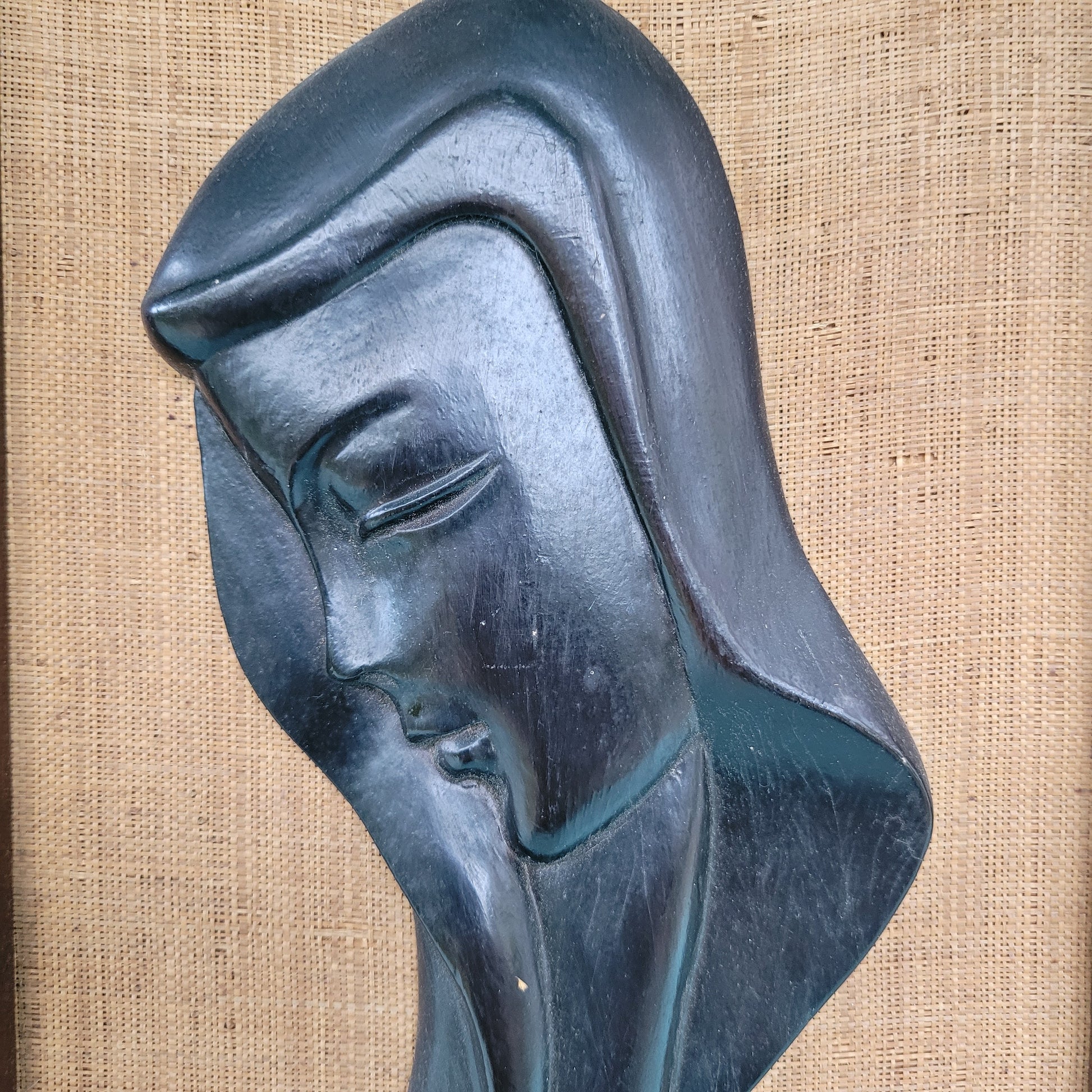 This framed ebony Madonna plaque from the 1950s, standing 43 cm tall and 22.5 cm wide, showcases exquisite craftsmanship from the Philippines. The deep, luxurious ebony wood beautifully emphasizes the detailed design, capturing the essence of mid-century religious art. It’s a remarkable piece that will enhance both collectors' displays and spiritual settings alike.