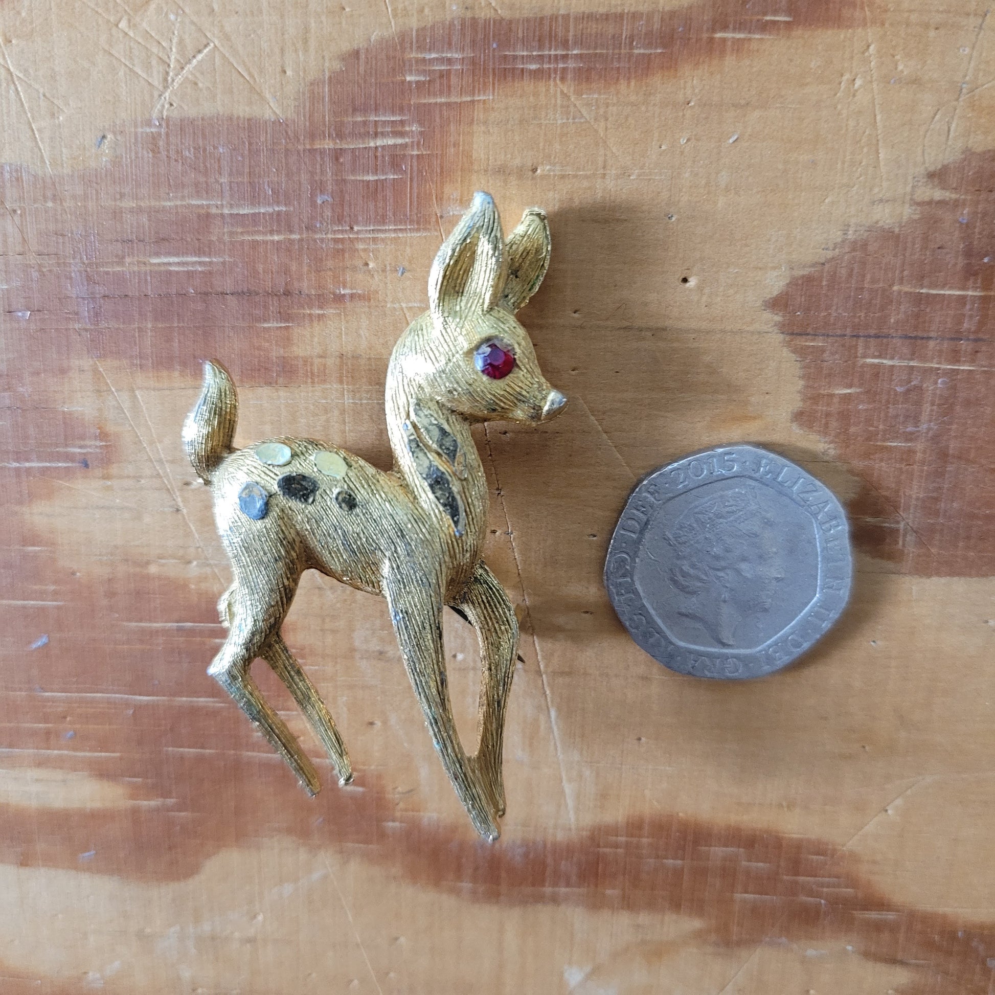 1950s gold-tone fawn brooch with red rhinestone eye