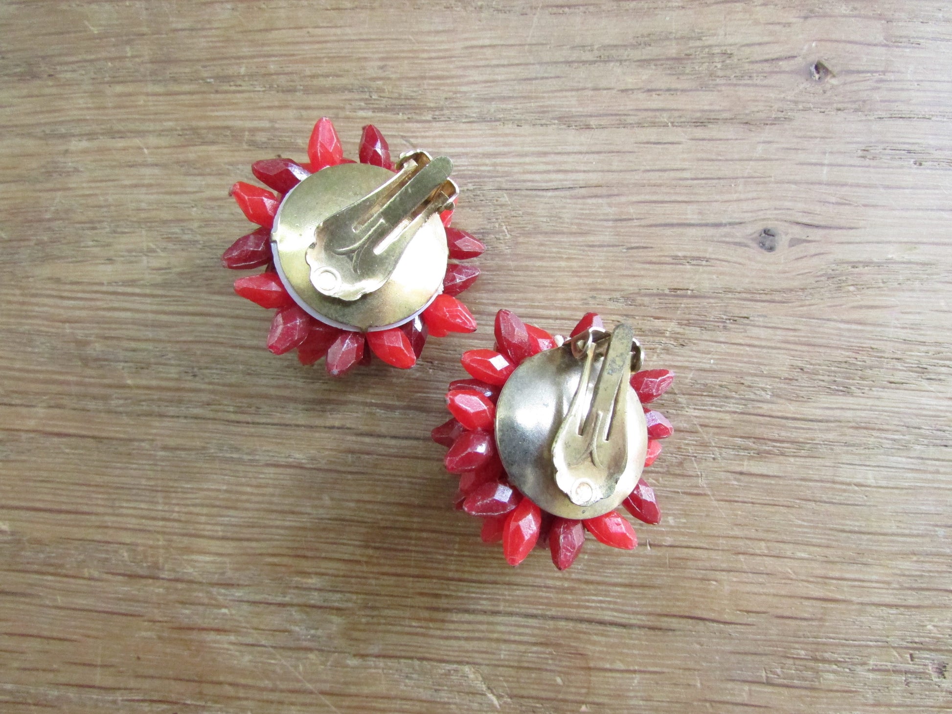 Add a touch of vintage glamour with these 1950s red cranberry faceted bead flower clip-on earrings. Measuring 3cm in diameter, their vibrant cluster design captures light beautifully, making them perfect for enhancing any outfit with a timeless, elegant charm. Easy to wear and classic in style, these earrings are a striking accessory for those who appreciate retro-inspired fashion.