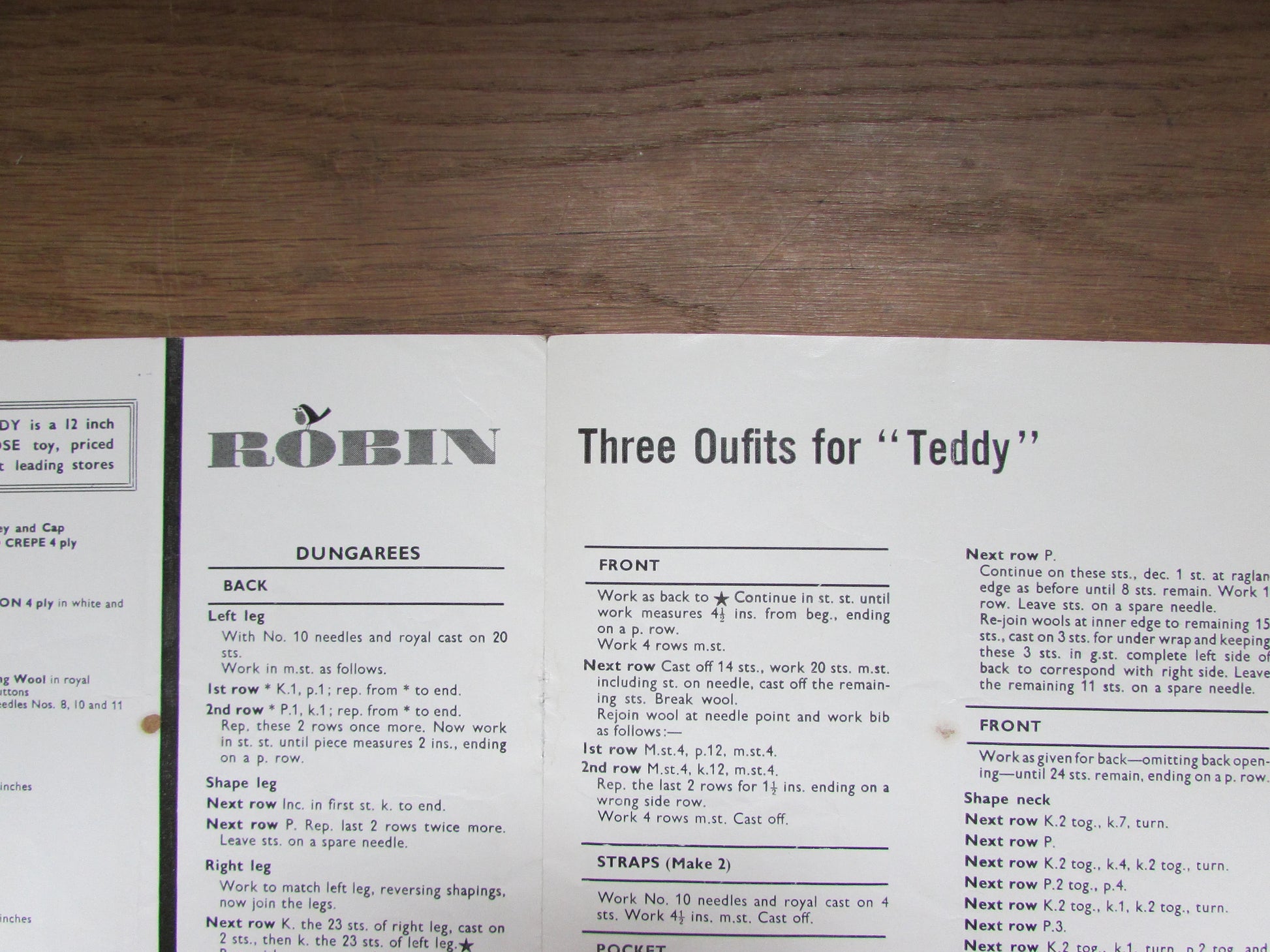 1960s/70s Robin 1175 knitting pattern for three outfits for "Teddy"