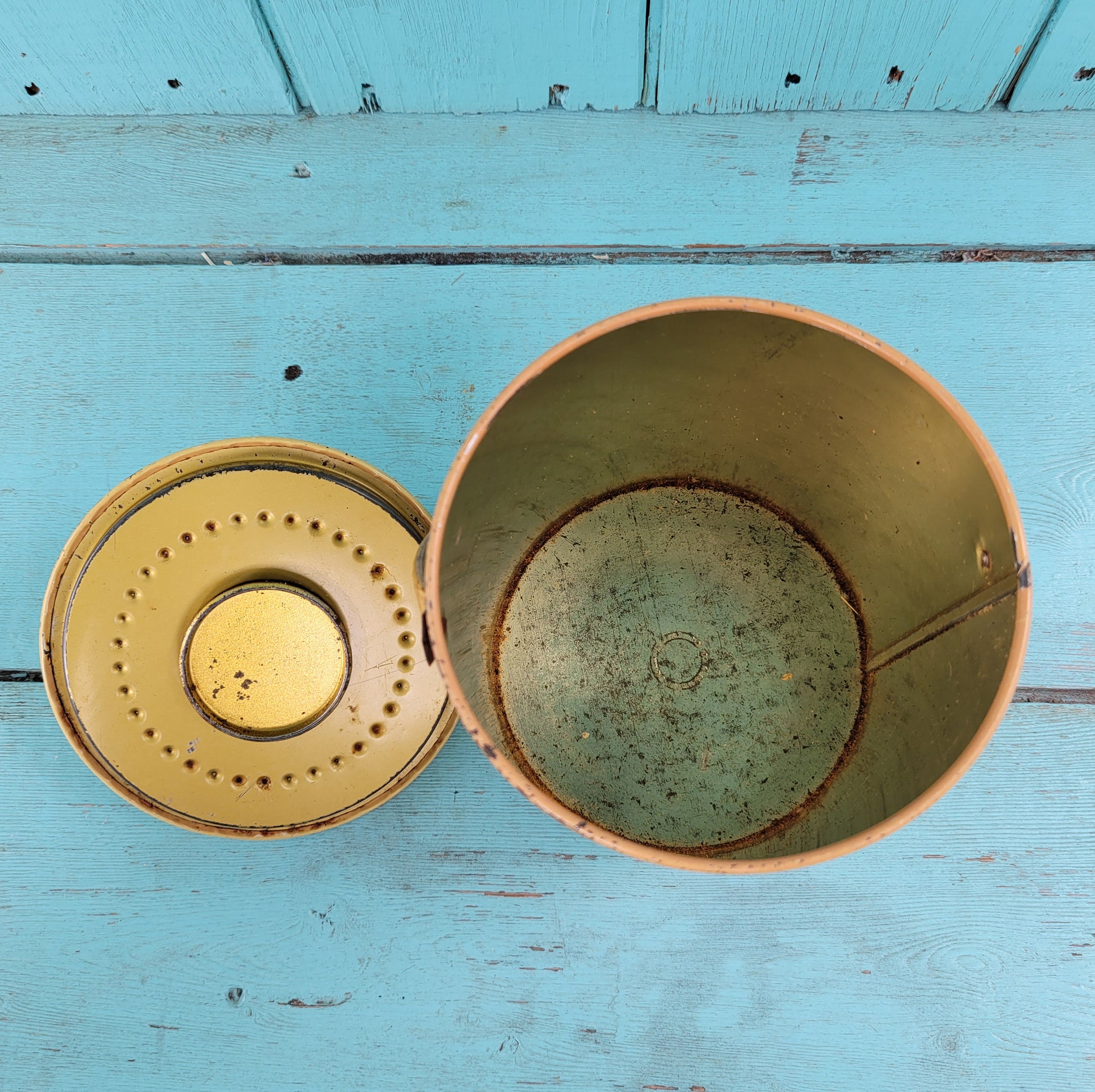 This charming vintage biscuit tin brings a splash of retro flair to any kitchen or collection. Featuring a delightful flower motif in warm taupe and navy tones, it's a genuine piece of 1960s/70s nostalgia. Made in England, this sturdy tin measures 16.5cm in height (excluding the handle) with an 11cm diameter—perfect for storing biscuits, buttons, or treasured trinkets.