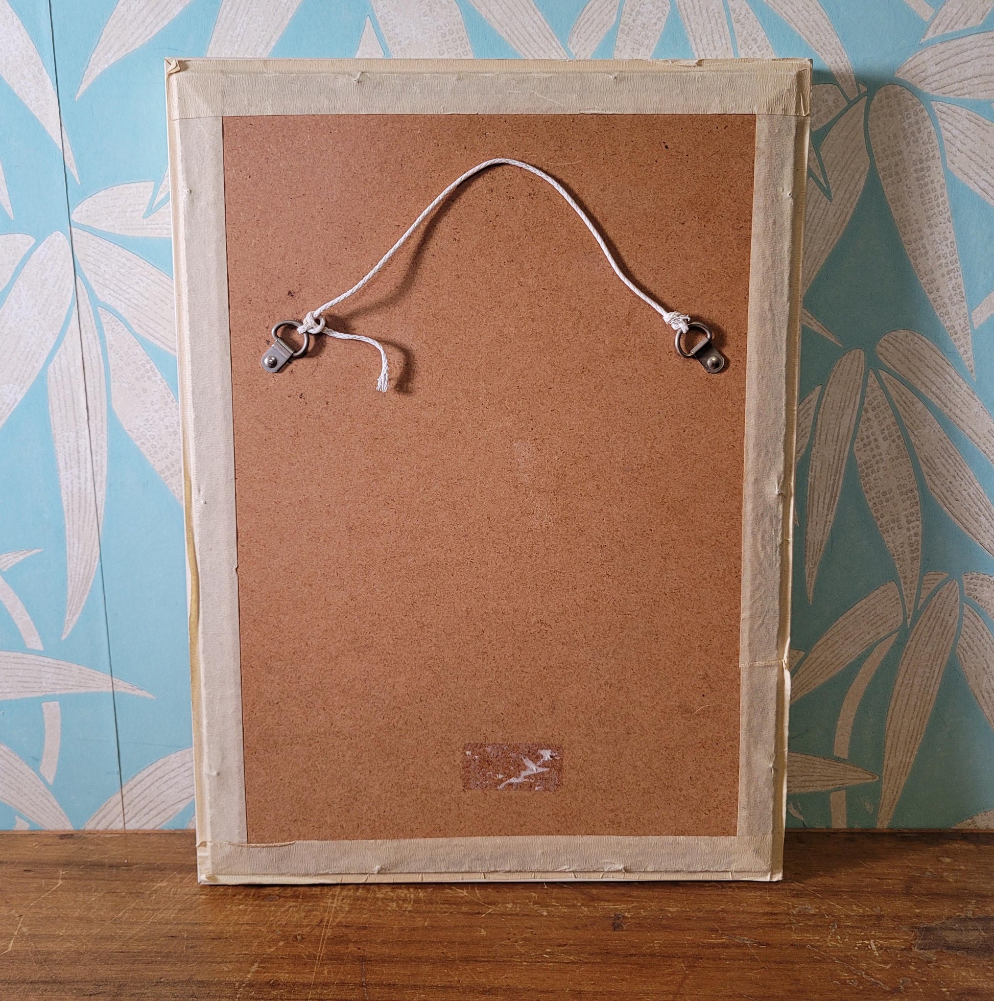 This vintage 1960s framed textile collage presents a delightful homemade design of a kitten surrounded by flowers. Sized at 39.5cm by 29cm, this charming piece blends nostalgic charm with decorative flair, perfect for collectors and fans of mid-century folk art. Its unique textures and composition truly embody the creativity of the era.