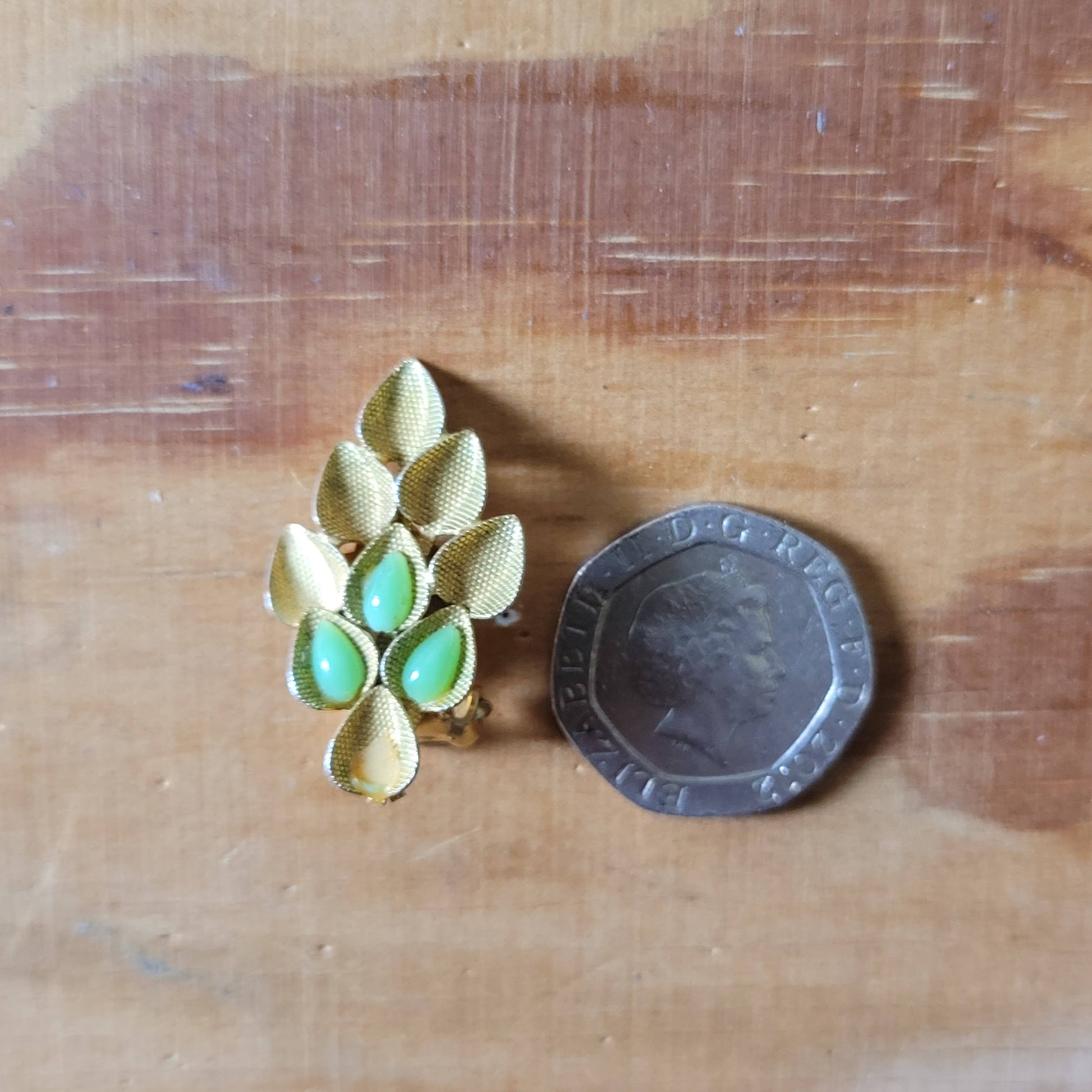 These vintage 1960s gold-tone clip-on earrings feature delicate leaf designs accented with vibrant green glass cabochons. Measuring 3cm, they add a subtle touch of retro elegance to any outfit. Perfect for vintage lovers seeking distinctive accessories with timeless appeal. Please note, a couple of the green stones are missing.