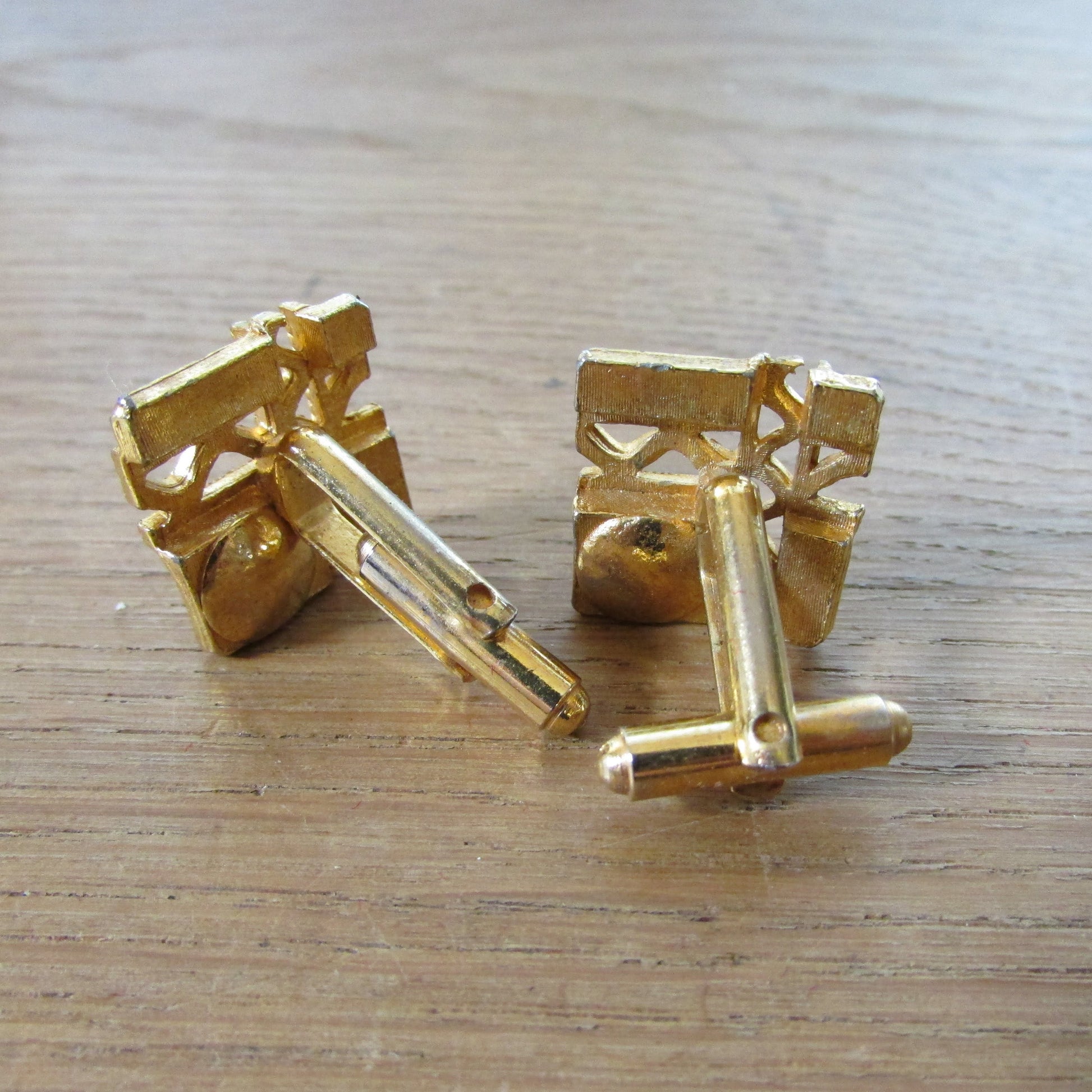 Crafted in gleaming gold-tone metal with eye-catching purple rhinestone accents and a distinctive diamond-cut finish, these 1960s Merlin cufflinks (approximately 1.5cm x 2cm) are perfect for adding a dash of nostalgic pizzazz to any formal ensemble. Whether you're channelling Mad Men vibes or simply adore mid-century glamour, these collectible cufflinks are guaranteed conversation starters that'll have everyone asking where you found such treasures.
