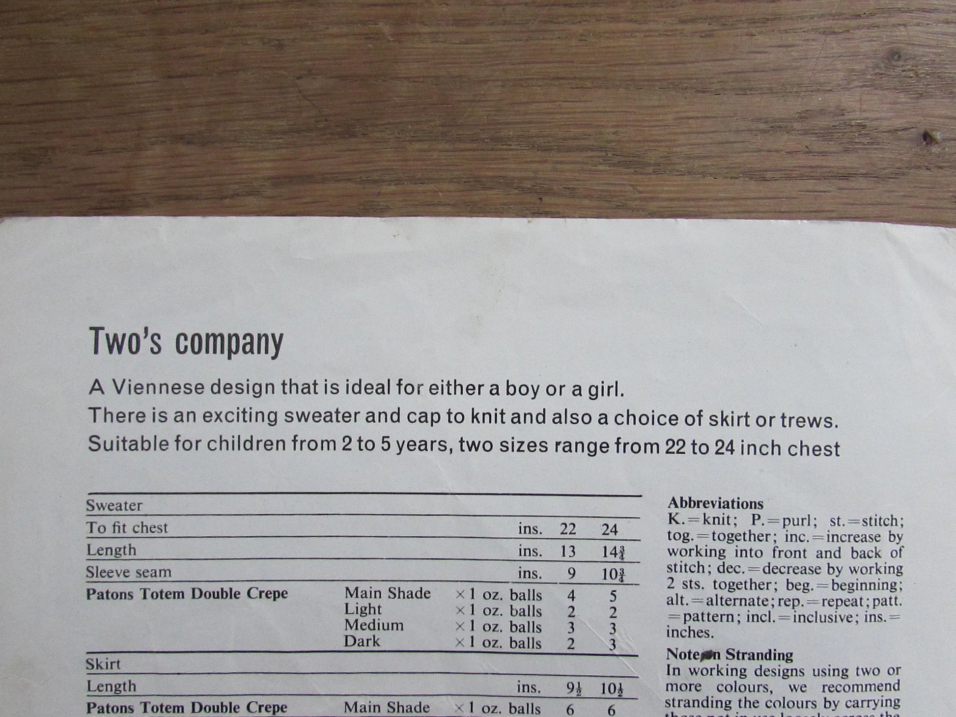 1960s Patons 9760 knitting pattern for child's sweater, cap, skirt or trews