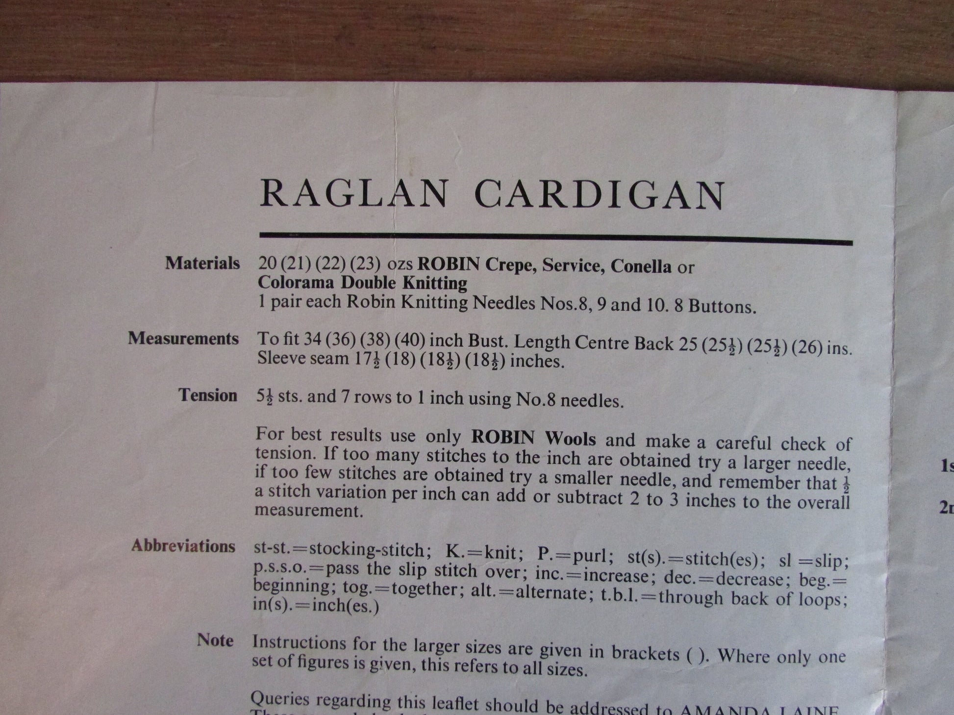 1960s Robin 1034 knitting pattern for Raglan cardigan