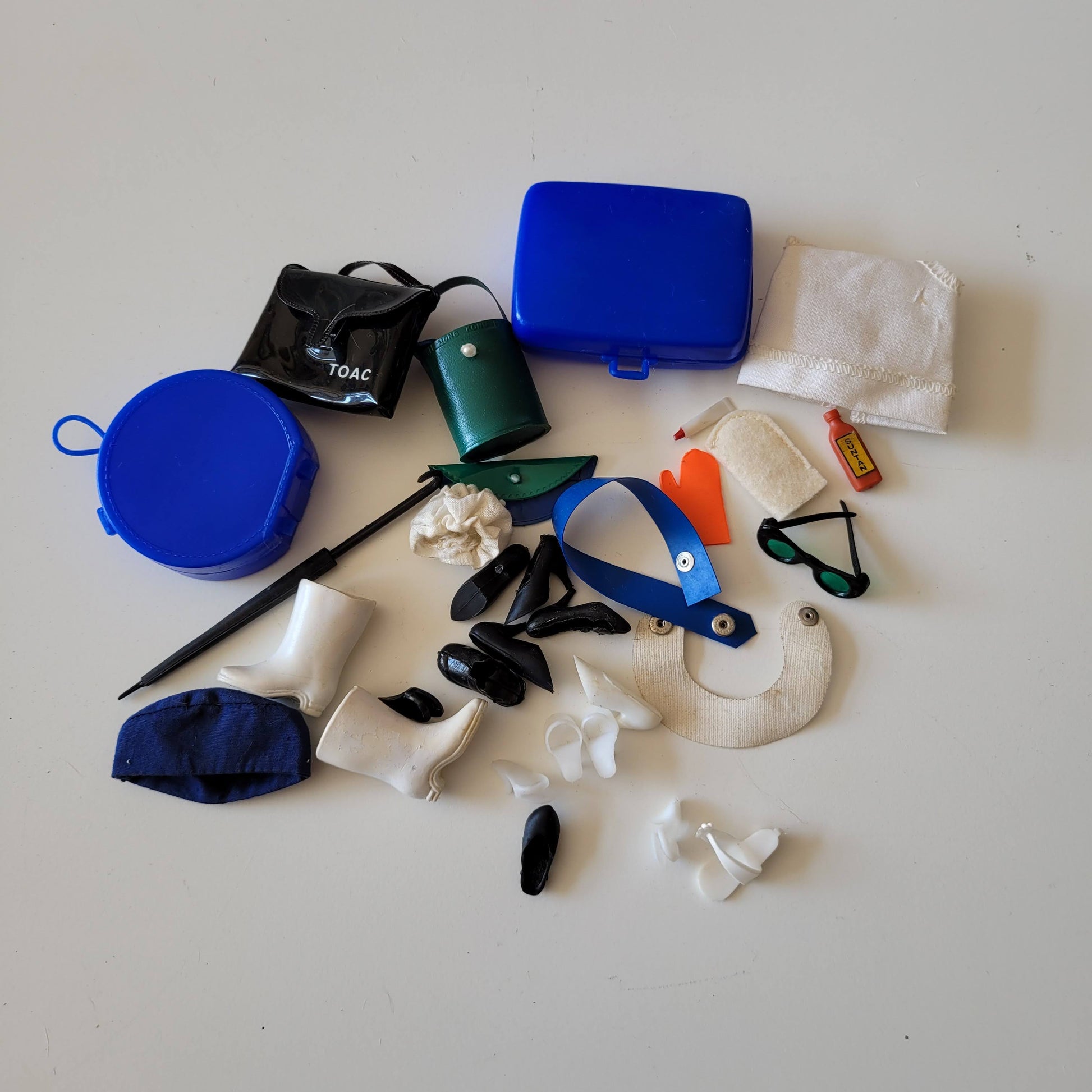 Includes assorted clothes and accessories from 1960s Tressy & Sindy fashion collections.