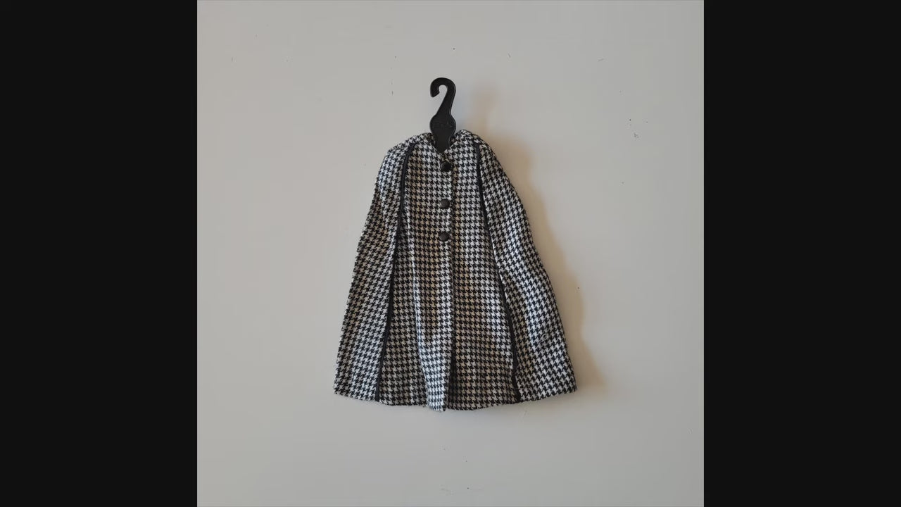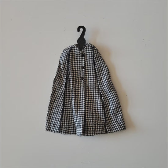 Tressy - black & white Houndstooth coat, & burgundy shift dress (Winter Journey) / Air hostess outfit / red plastic mac, & grey shift dress (Leather Look) / blue party dress with white lace on skirt (Evening Date) / geometric blue print shoulder cape dress (Walk in the Park) / black & white polka dot dress (After Six)
