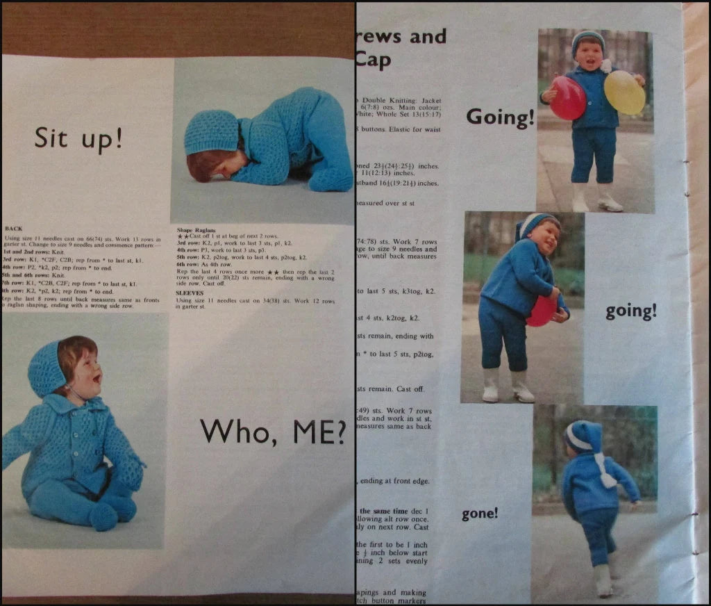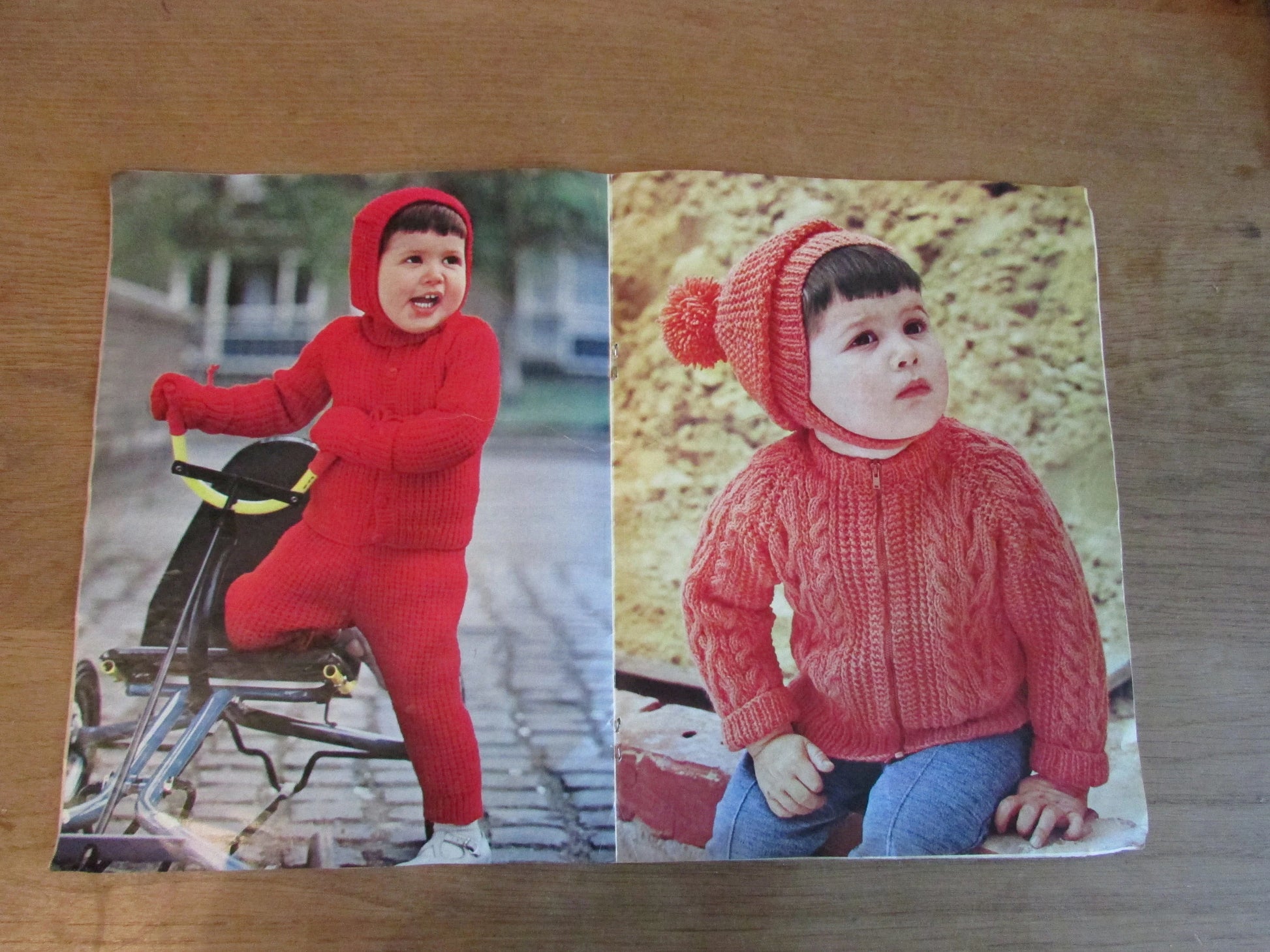 hooded coat & leggings / three-piece / two-piece / classic trio / sweater & bonnet / matinee coat / boy's outfit / Aran jacket & helmet / pram set / jacket, trews & stocking cap / boy's set / toddler's dress / party dress / cross-over cardigan / christening robe / 3-ply cardigan / cable sweater