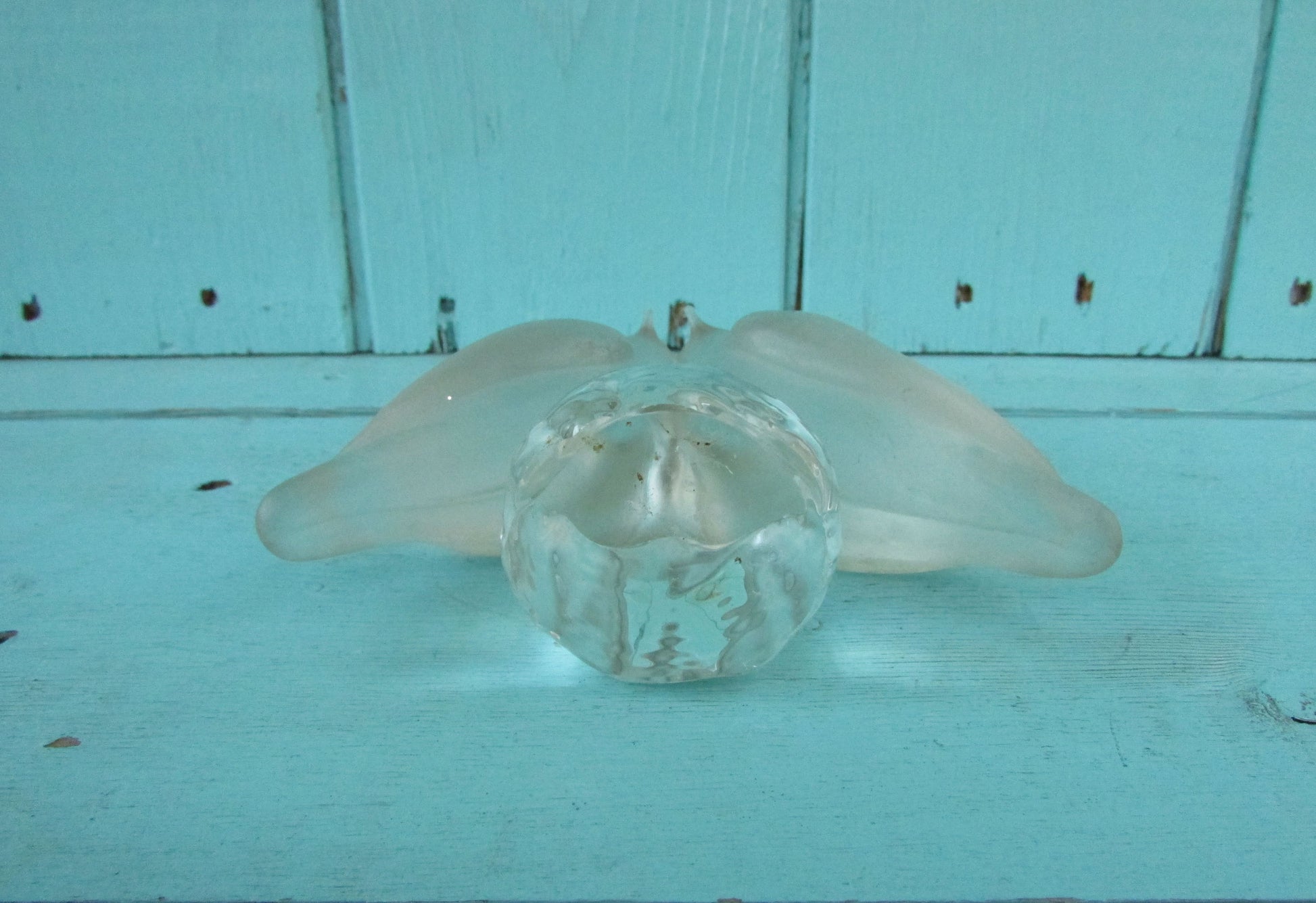 This charming 1970s/80s Swedish frosted glass Love Birds ornament from Reijmyre Kristall measures approximately 8cm tall by 10.5cm long. Its delicate frosted finish beautifully captures the tender connection between the two birds, making it a timeless symbol of love and togetherness. Perfect for adding a touch of Scandinavian elegance to your home or as a thoughtful gift, this exquisite piece blends vintage artistry with subtle charm.