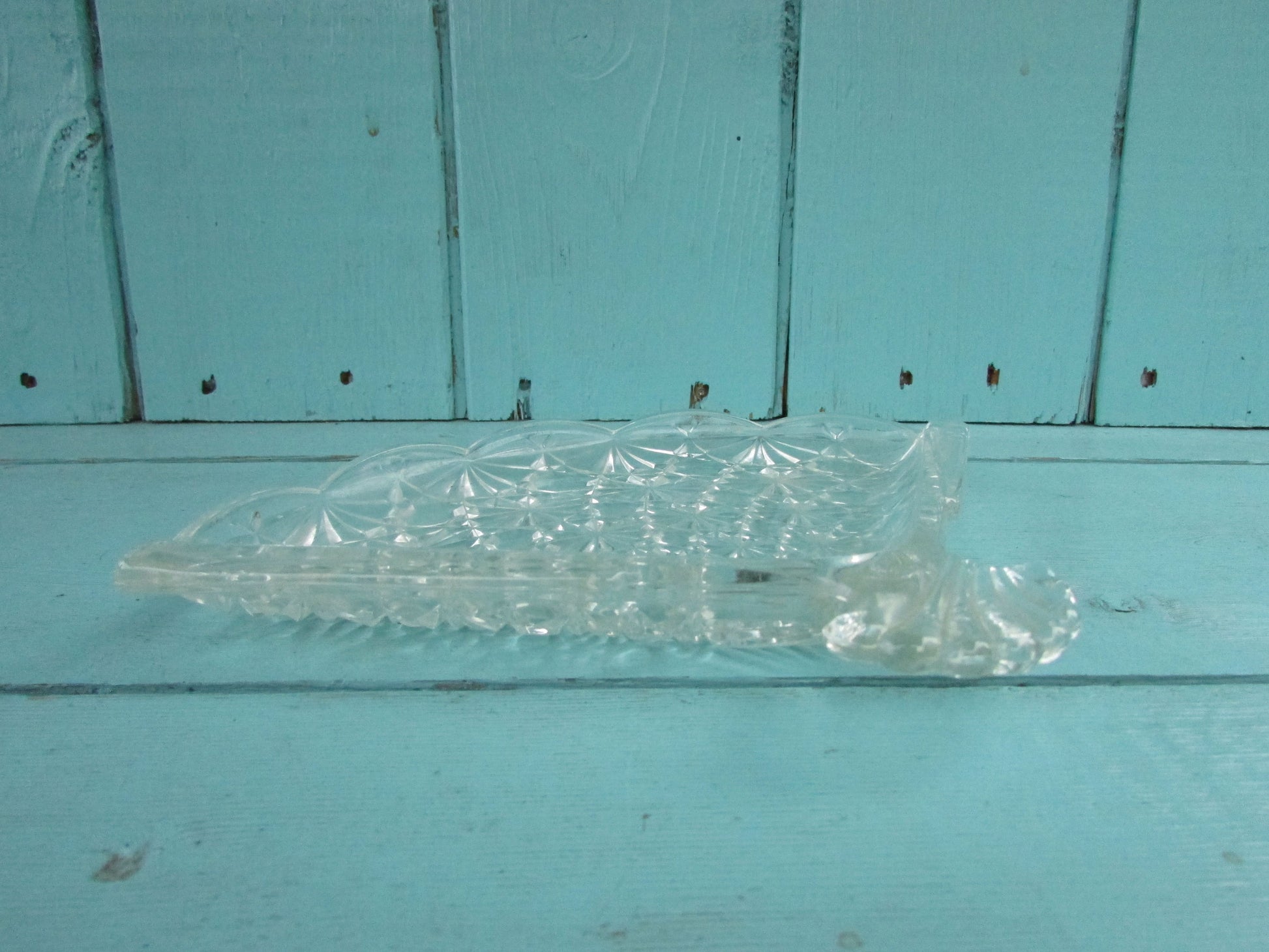 This charming 1970s Avon pressed glass dish features a unique triangular fan shape, perfect for displaying candies or trinkets. Measuring 20cm by 14.5cm and standing 1.5cm high, it adds a touch of vintage elegance to any setting. Its sturdy glass construction ensures lasting beauty while serving as a stylish conversation piece for your home. Ideal for collectors or those seeking a distinctive decorative accent.