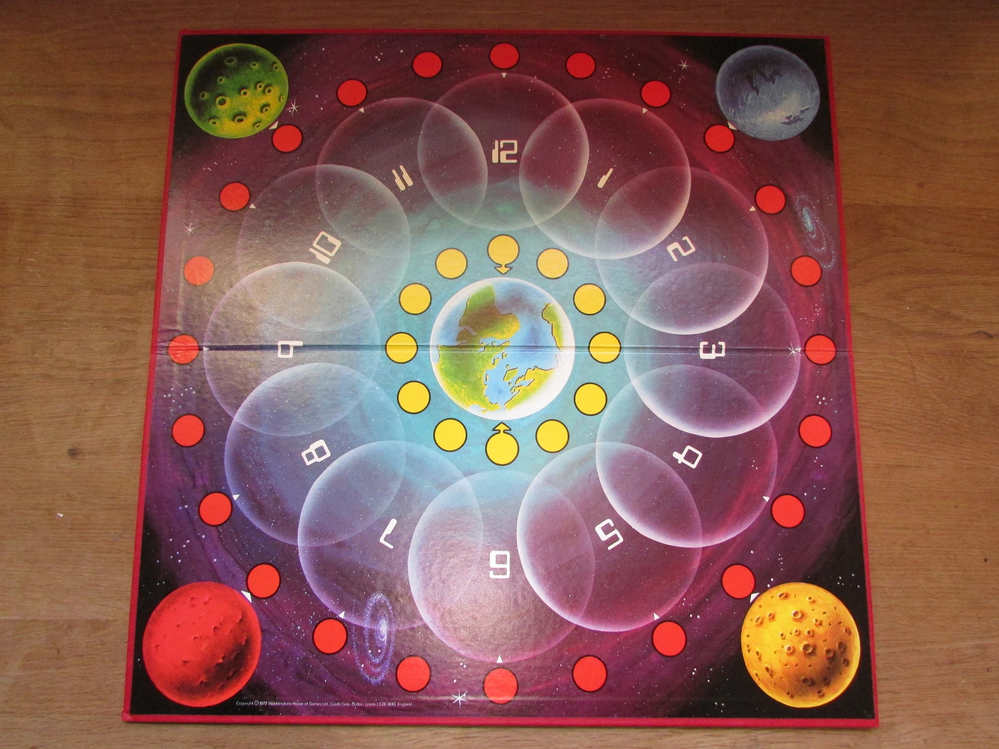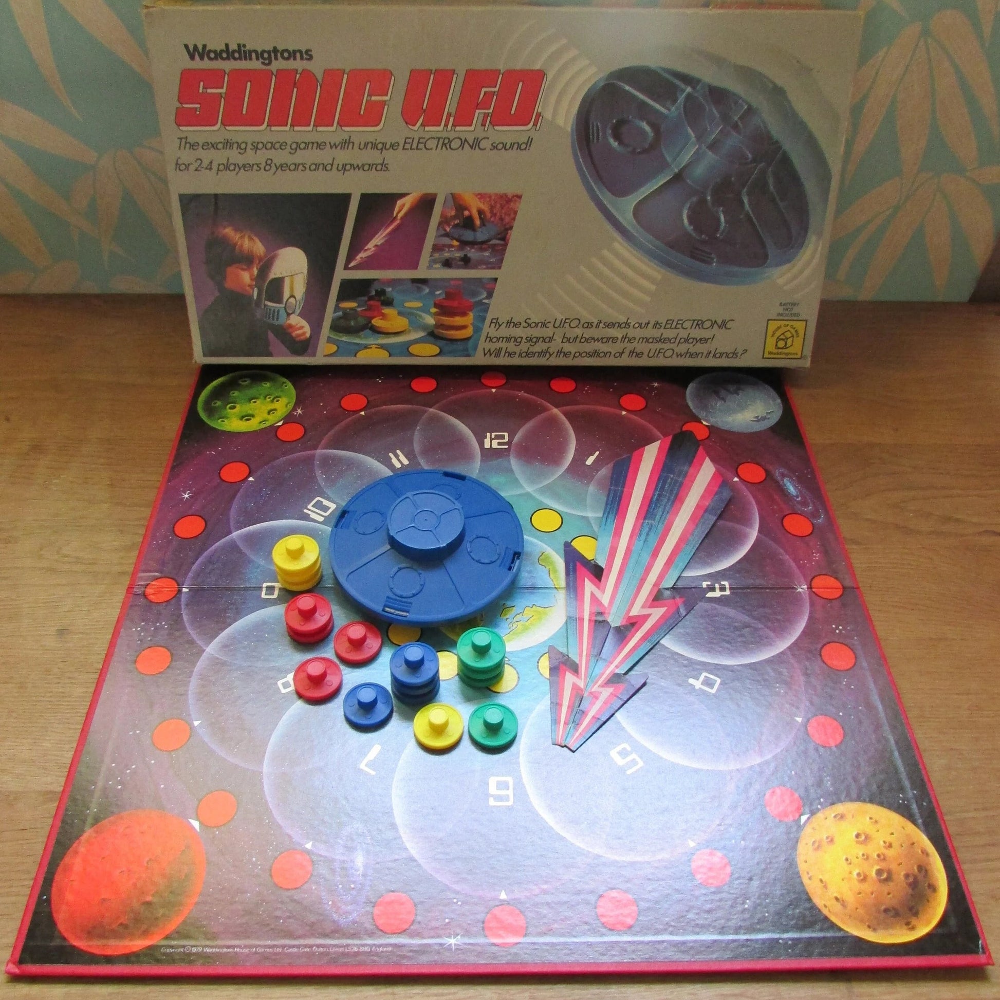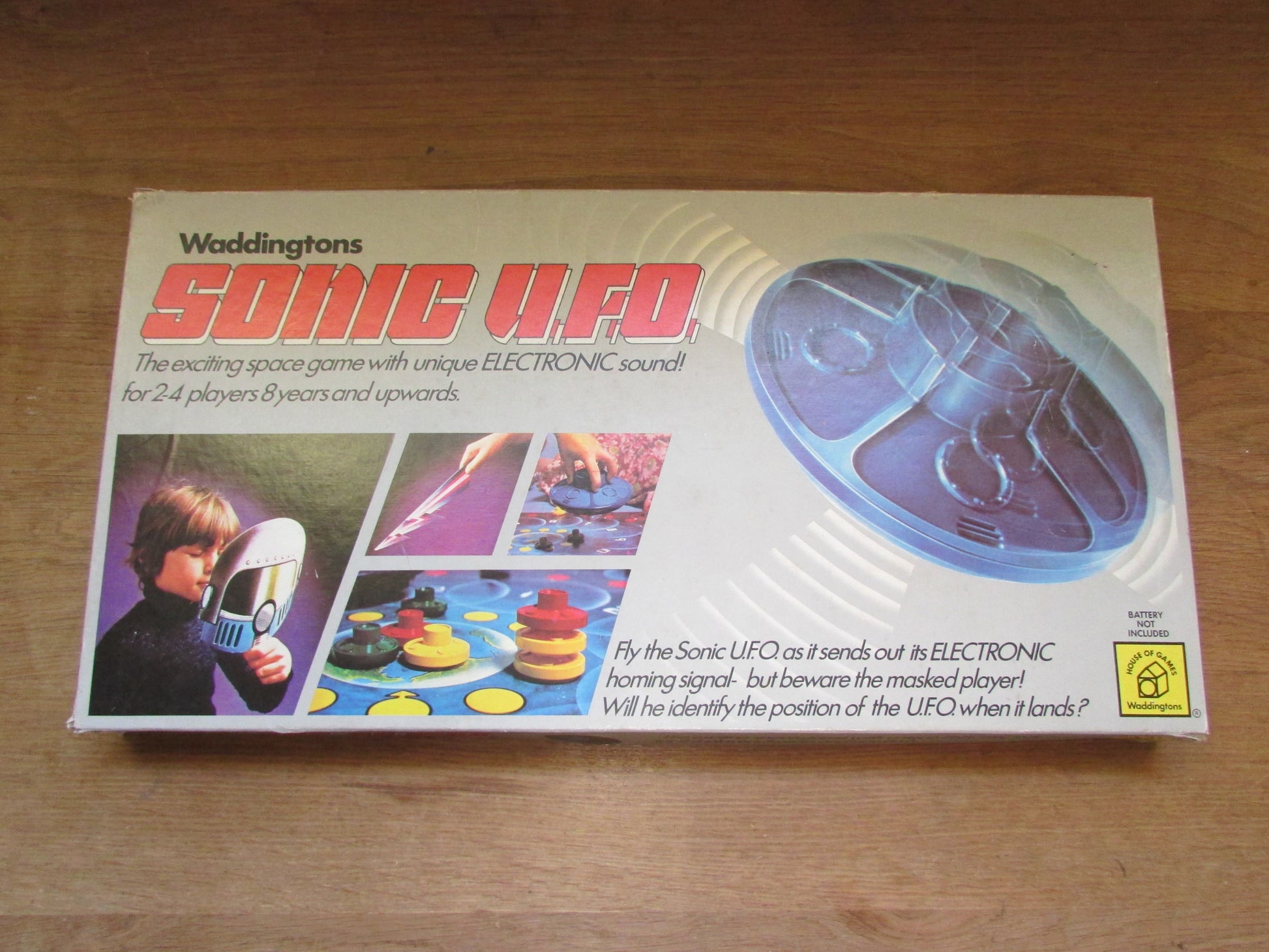 Sonic UFO is a 1979 space-themed board game by Waddingtons where players race to be the first to fly their four UFOs back to Earth. Gameplay involves a "blindfolded" mechanic where one player, using a mask, must identify the landing spot of the large, moving "sonic UFO" by its beeps to move their own smaller UFOs, with correct guesses allowing for movement and "ZAP" moves to send opponents back to outer space.
