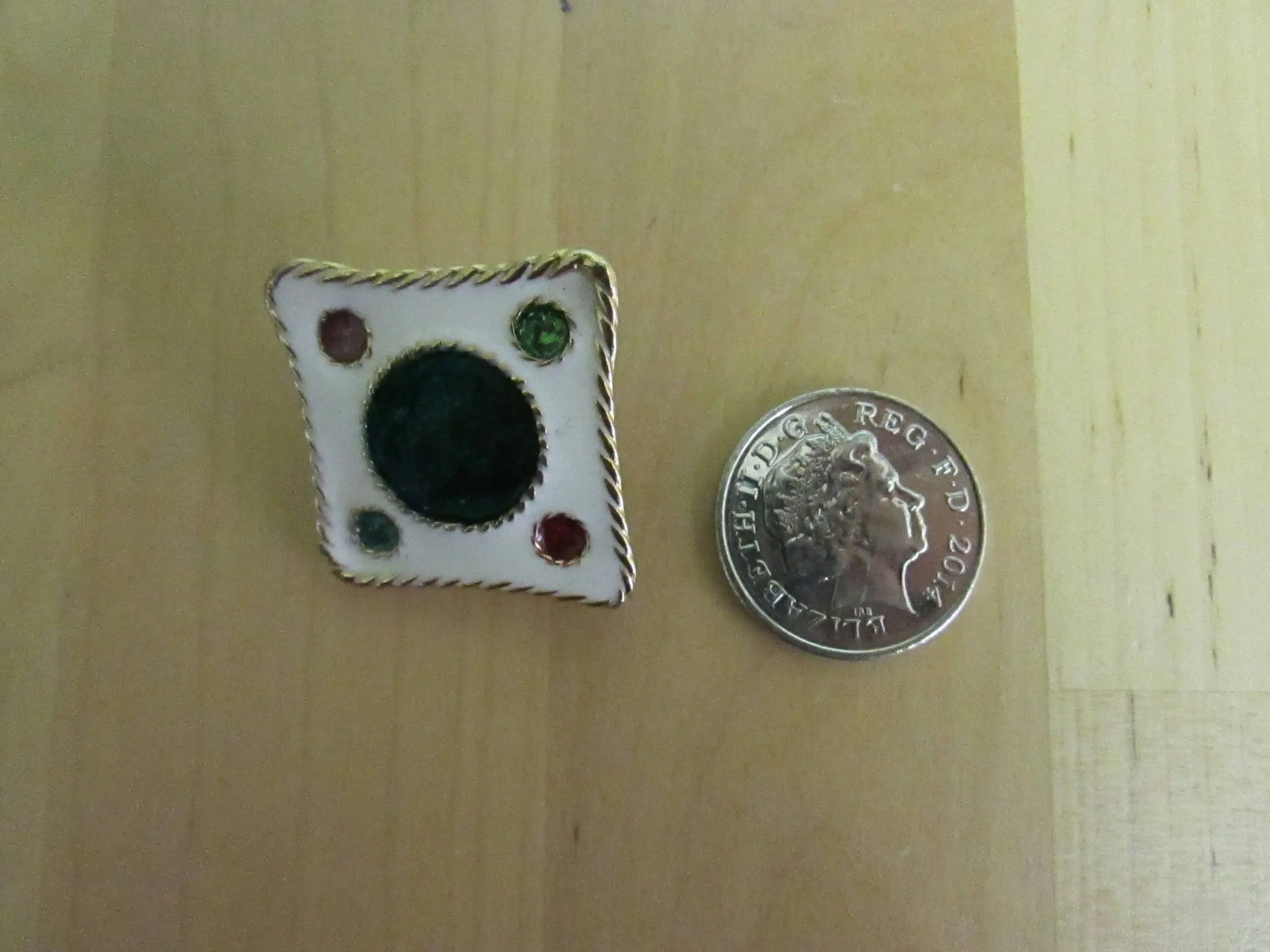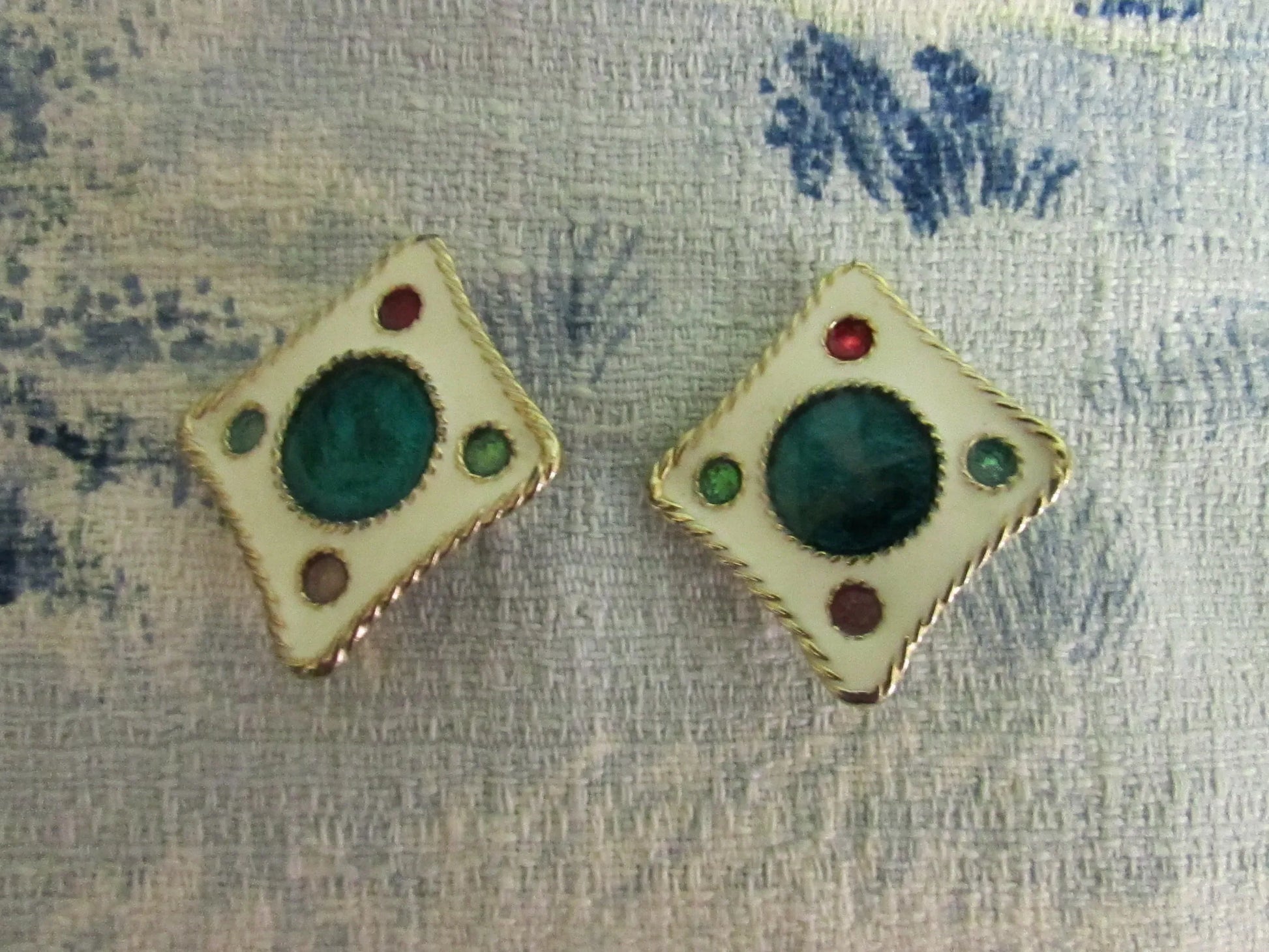 These 1980s clip-on earrings feature a bold heavy square design with vibrant enamel inlaid coloured spots, framed by elegant gold-tone edges. Measuring a compact 4cm by 3.5cm diagonally, they make a striking statement while remaining comfortable to wear. Perfect for adding a vintage pop of colour and sophistication to any outfit.