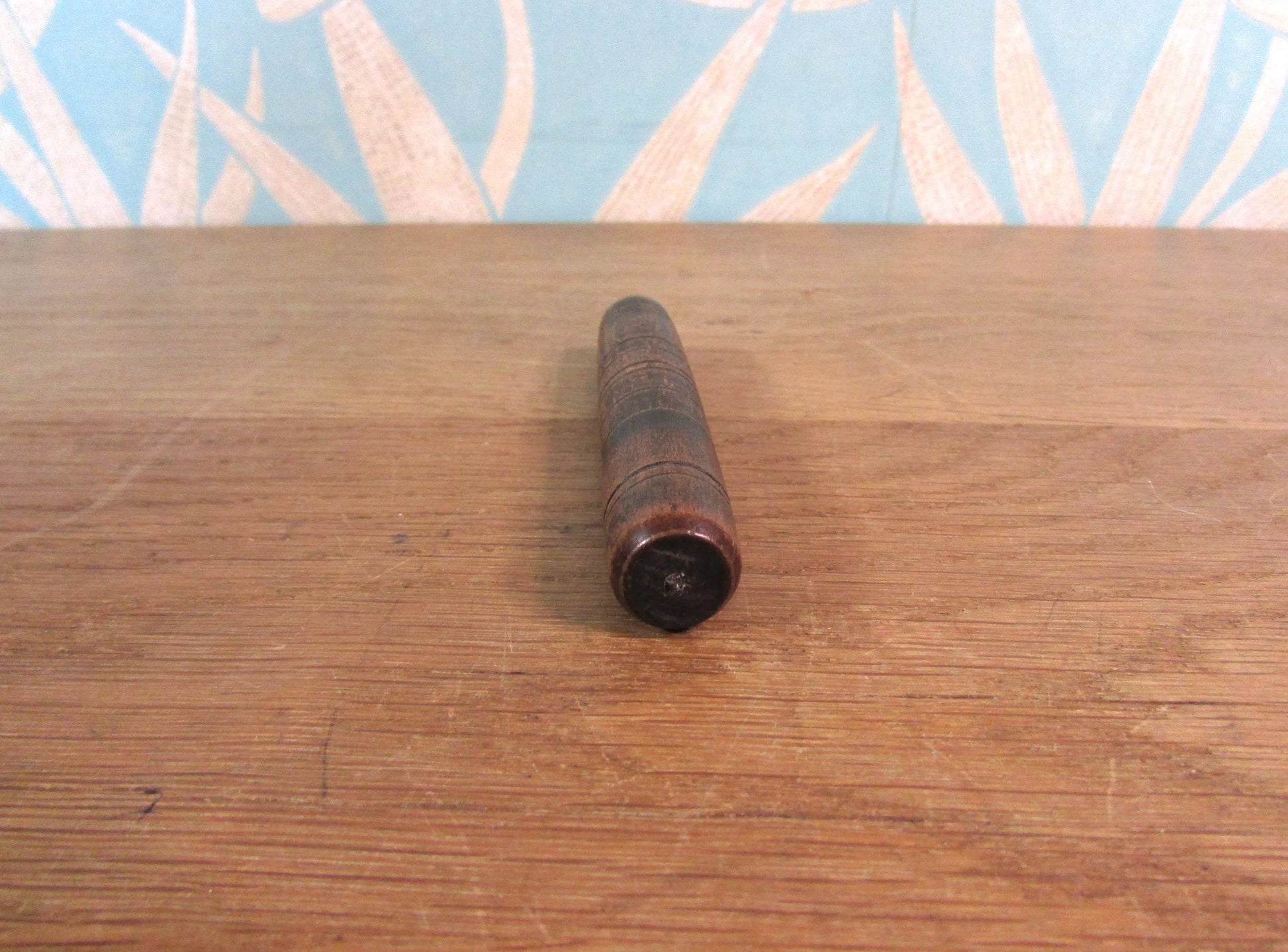 This charming turned wooden needle holder is a delightful piece of Victorian-era craftsmanship, measuring a compact 10cm in length. Perfect for the sewing enthusiast or collector, it showcases the intricate woodturning techniques that defined the period. The elegant cylindrical design makes it both functional and decorative—ideal for keeping your needles organised whilst adding a touch of vintage character to your workspace. A wonderful conversation starter for anyone who appreciates handcrafted treasures from yesteryear.