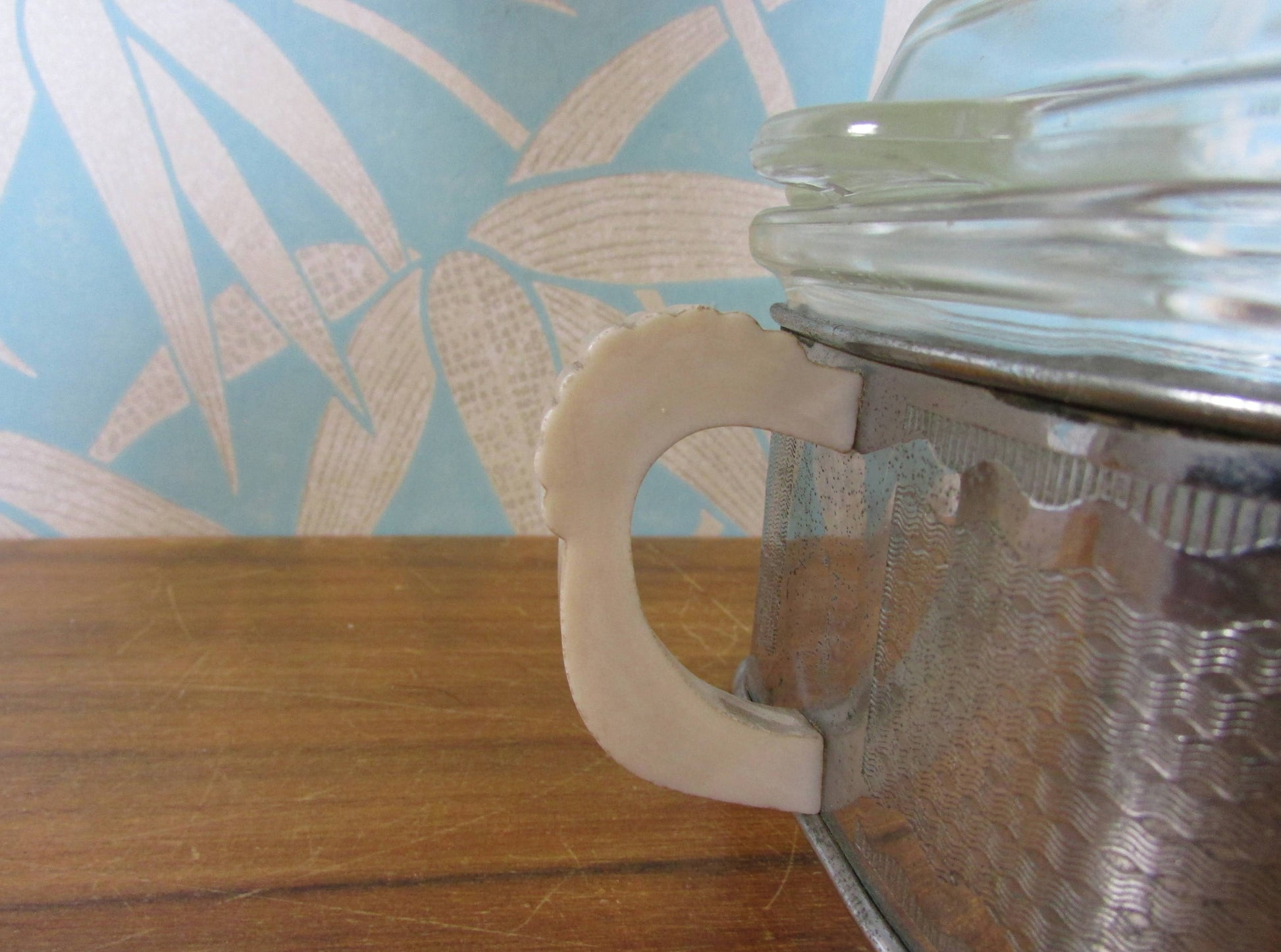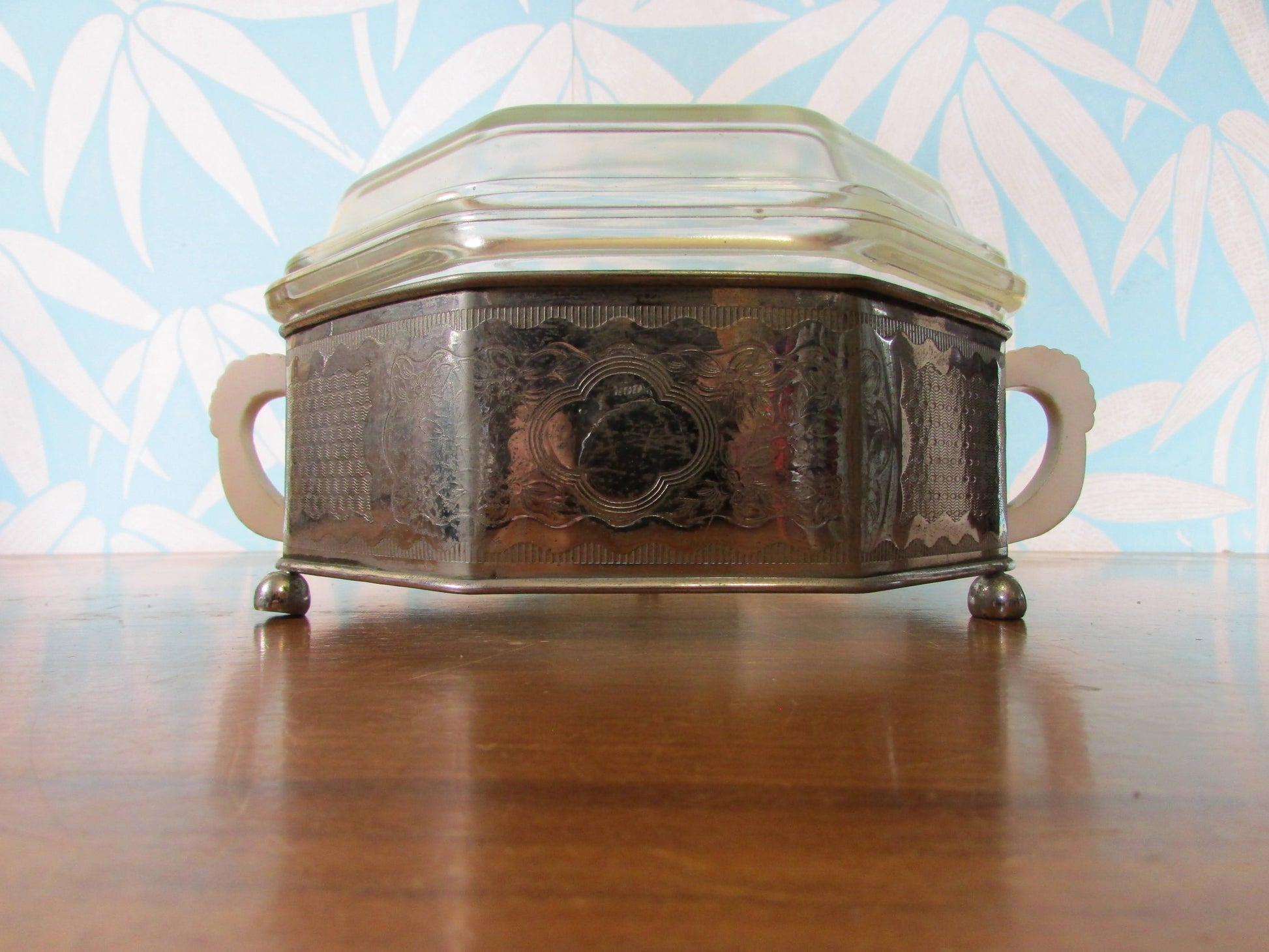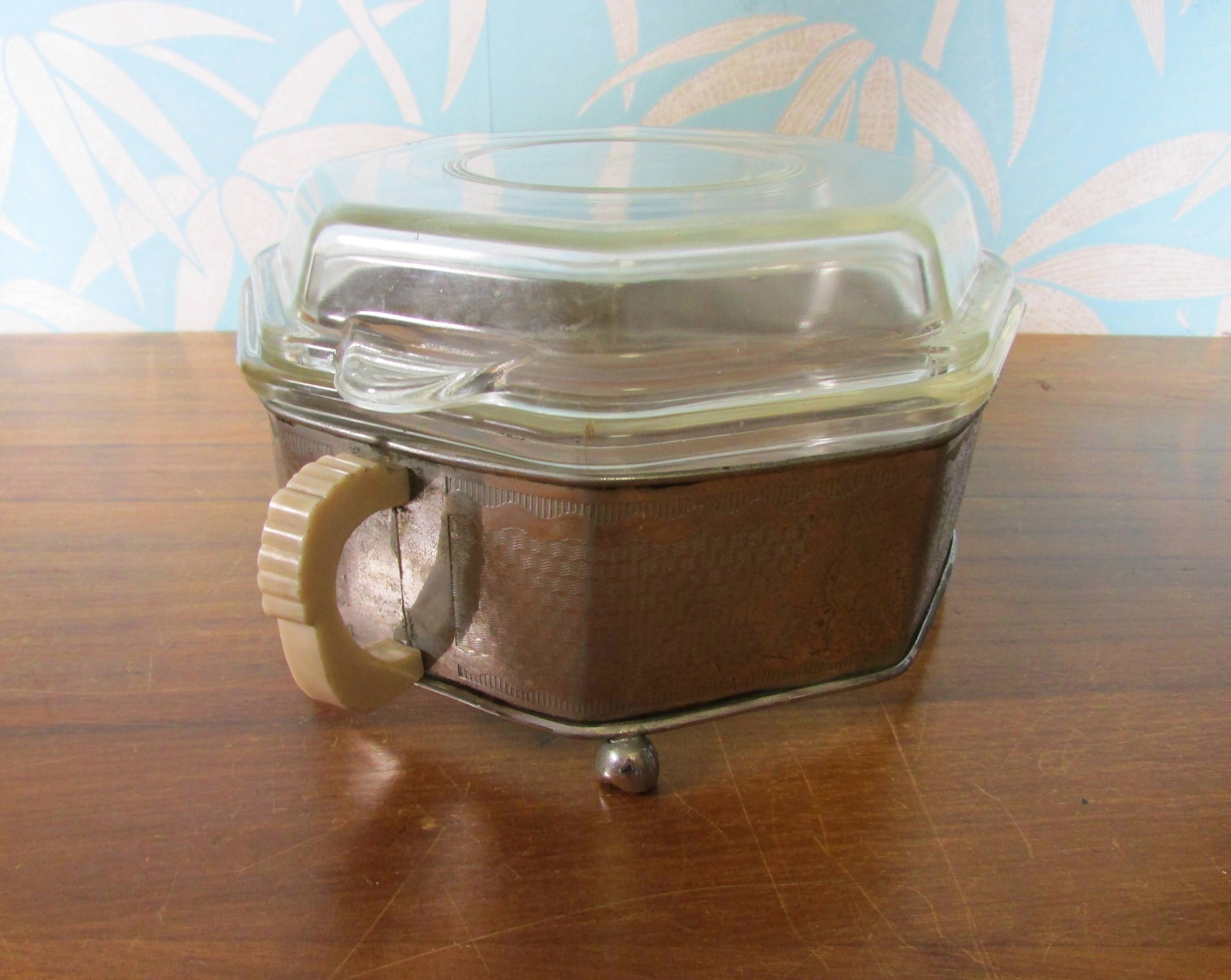 Art Deco Phoenix octagonal glass roasting dish with silver plate & Bakelite plate