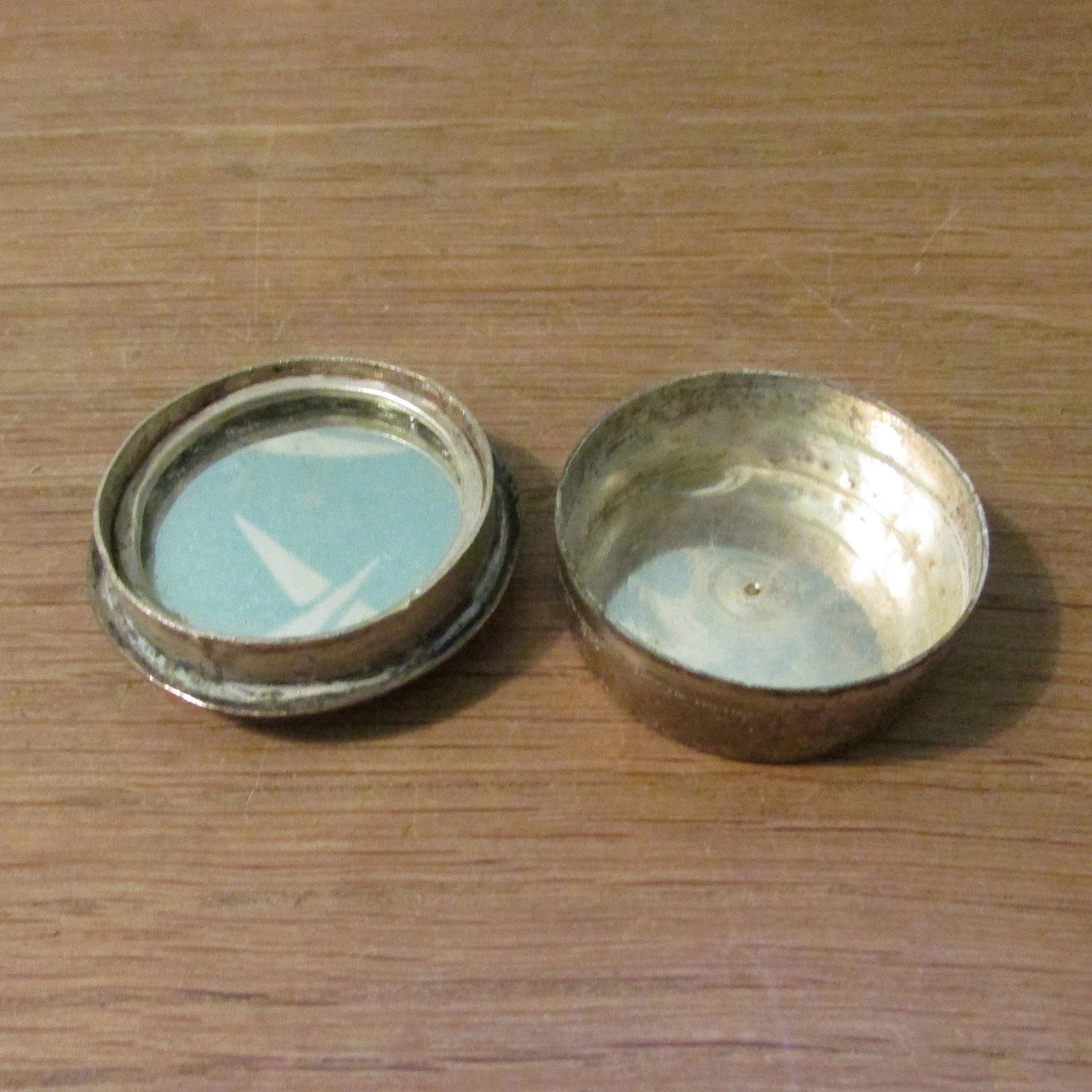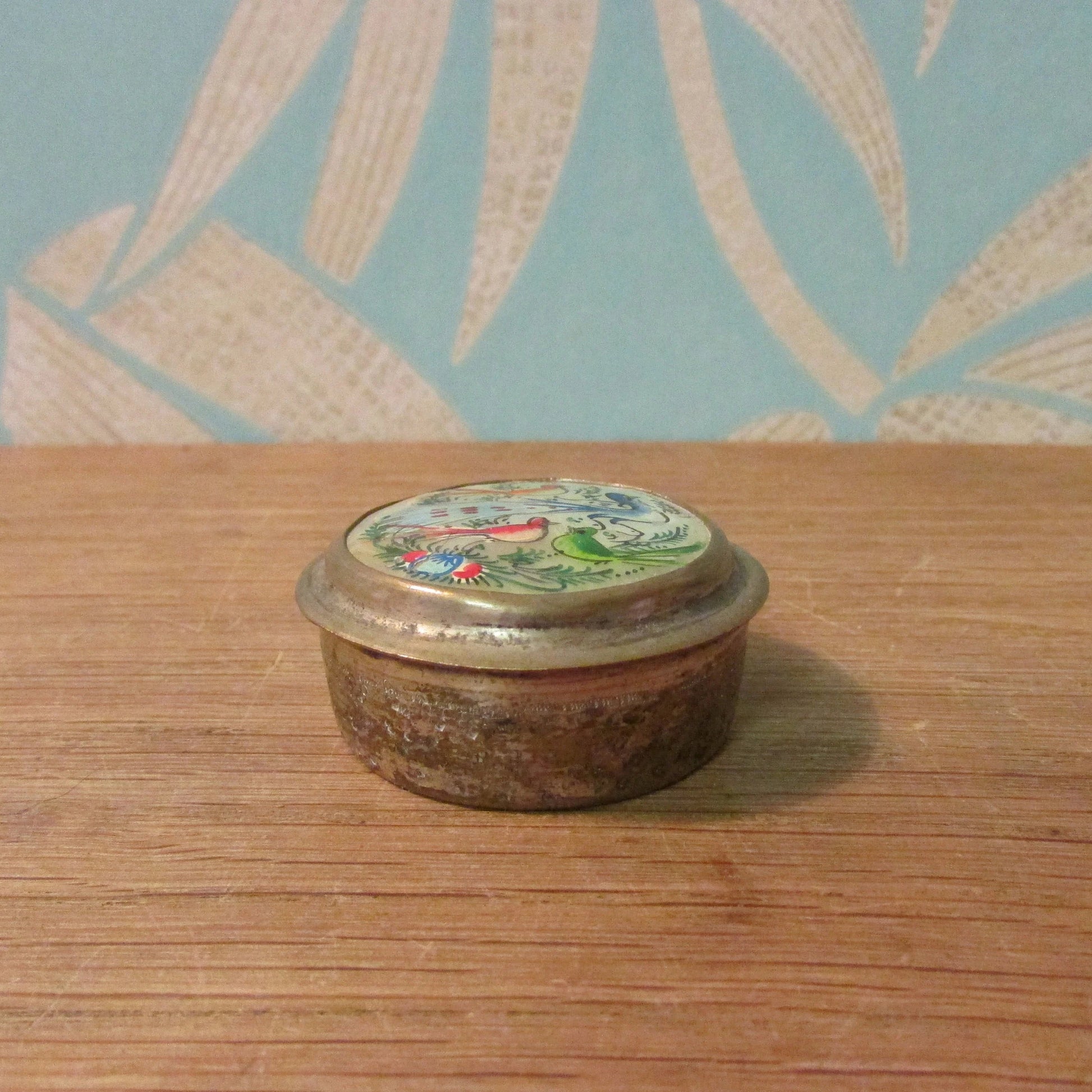 A charming piece of vintage elegance from the 1940s-50s, this Persian silver snuff box is a treasure for collectors. Adorned with exquisite hand-painted birds dancing across lustrous mother of pearl, it's a miniature work of art. The internal mirror adds a practical flourish, while the compact 5cm diameter and 2cm depth make it perfectly pocket-sized for displaying or gifting.