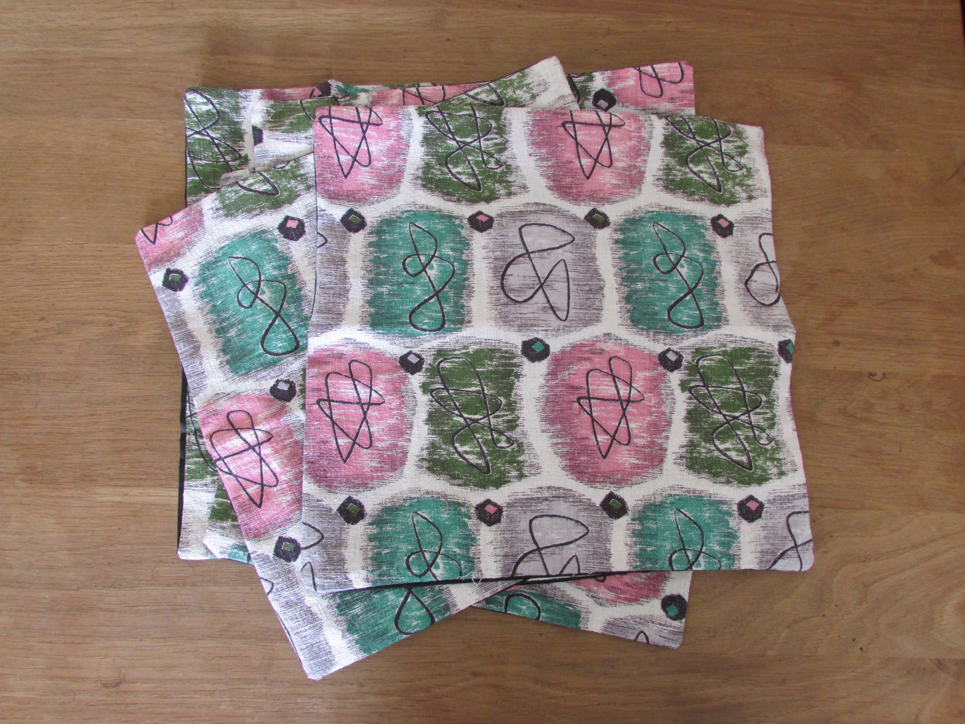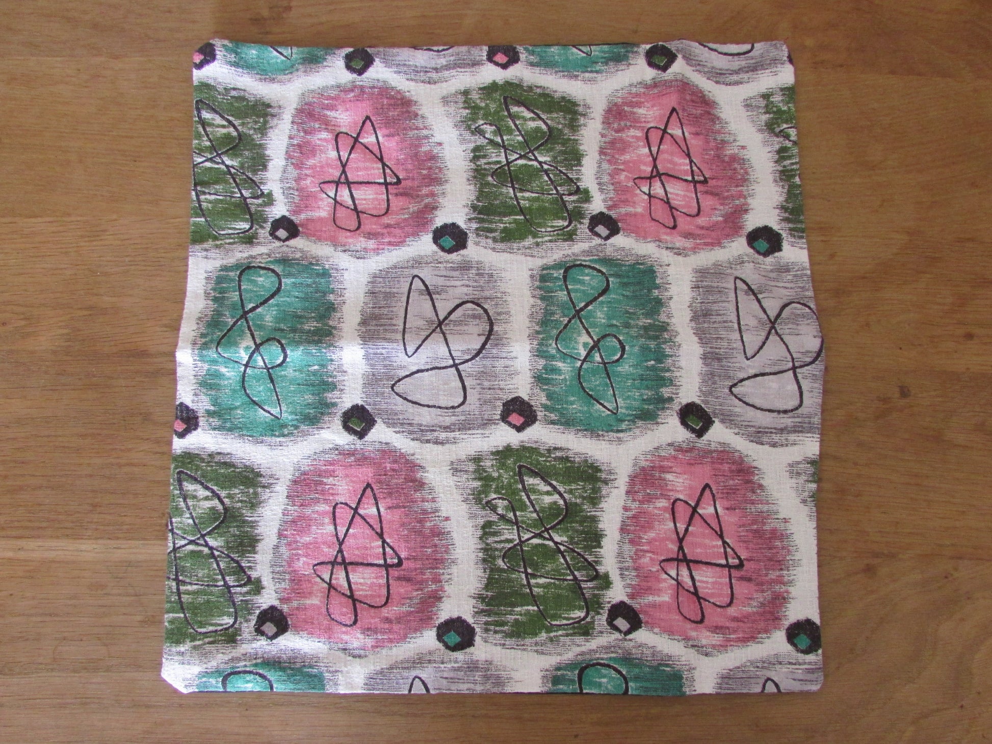 Home-made 1950s pink & green atomic barkcloth cushion cover with contrast black reverse
