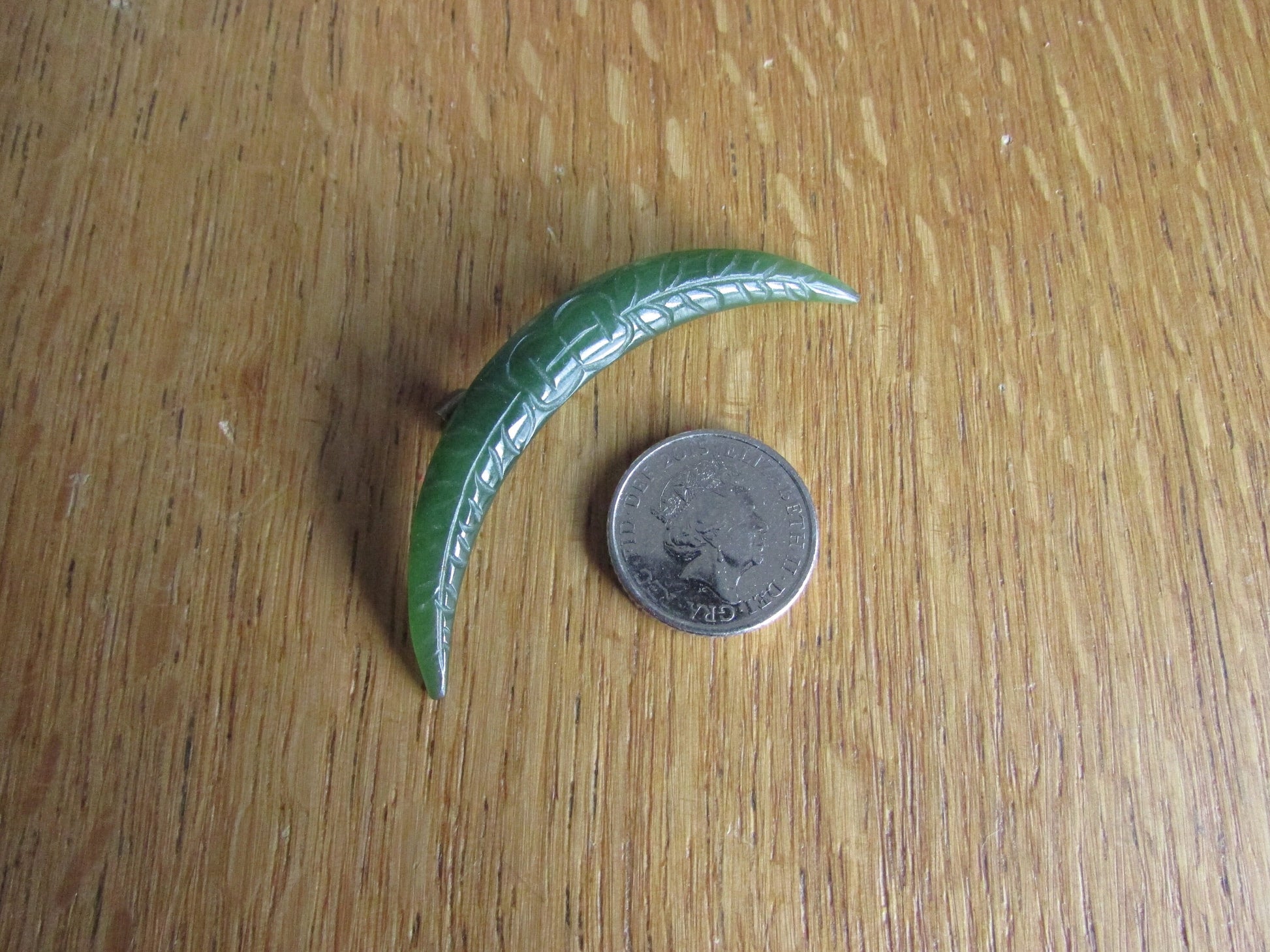 This unique brooch, measuring approximately 5 cm, features a vintage carved jade crescent handcrafted by me. Its timeless design adds a subtle touch of elegance to any outfit, making it a perfect accessory for those who appreciate distinctive, artisan-made jewelry. Elevate your style with a piece that carries both history and personal craftsmanship.