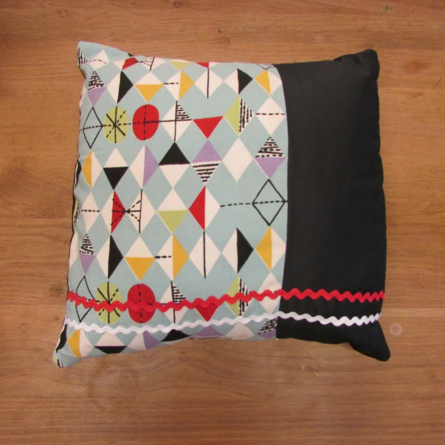 Home-made mid-century Marian Mahler atomic fabric cushion with red, & white ric-rac, and contrast black reverse