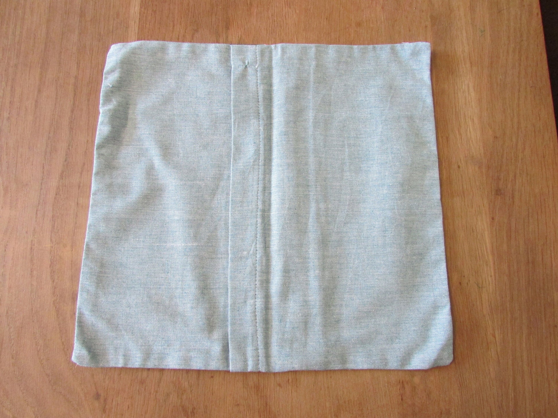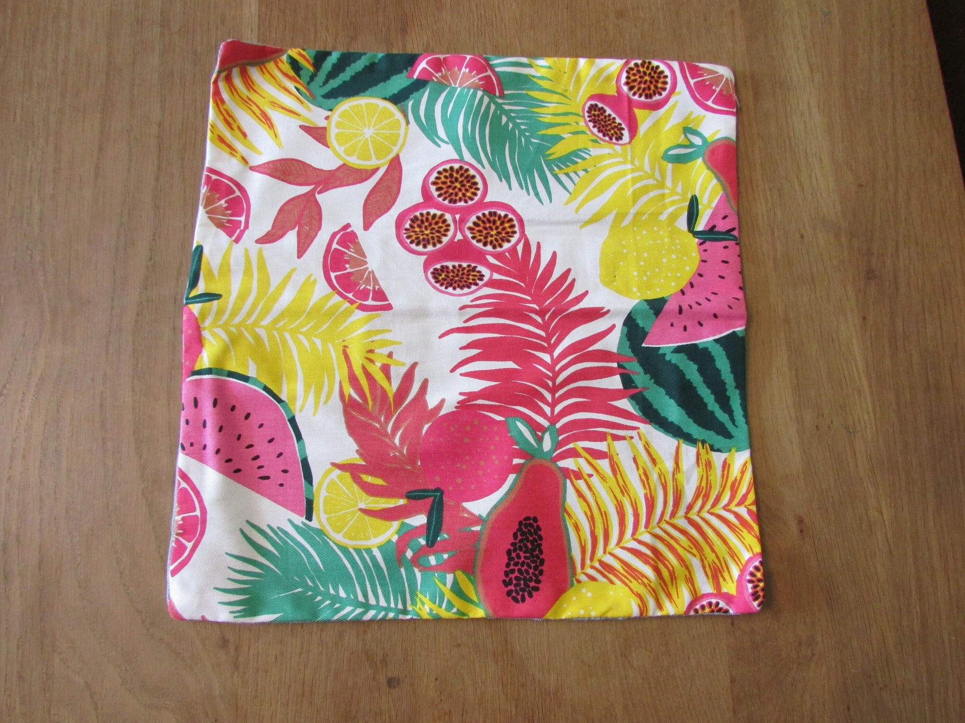 Home-made retro bright tropical print cushion cover with contrast eau de nil reverse