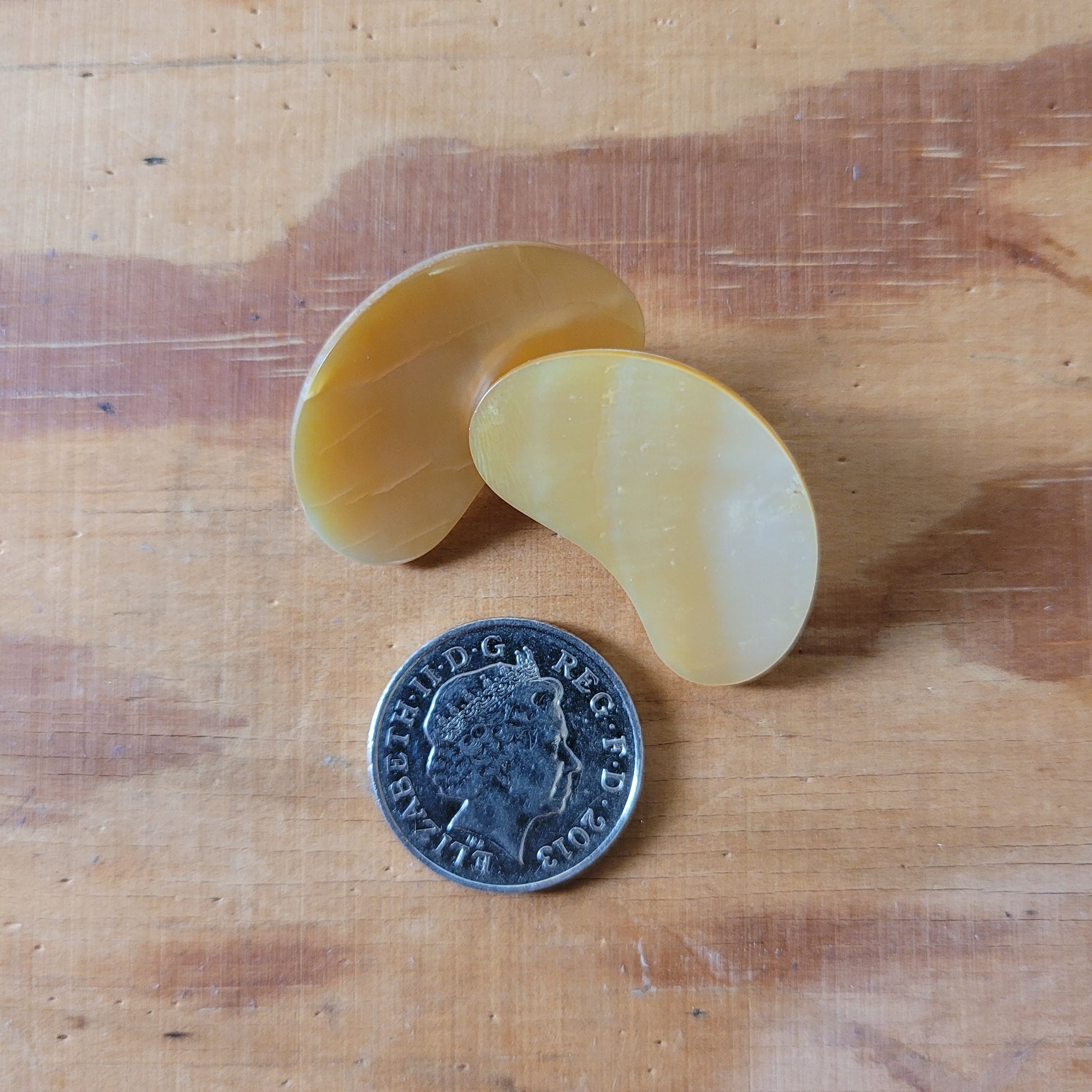 These large 1960s kidney bean-shaped clip-on earrings feature lustrous mother of pearl, adding a timeless elegance to any outfit. Measuring 3.5cm by 2cm, their unique shape and vintage charm make them a standout accessory that effortlessly combines retro style with subtle sophistication. Perfect for those seeking classic statement pieces without the need for pierced ears.