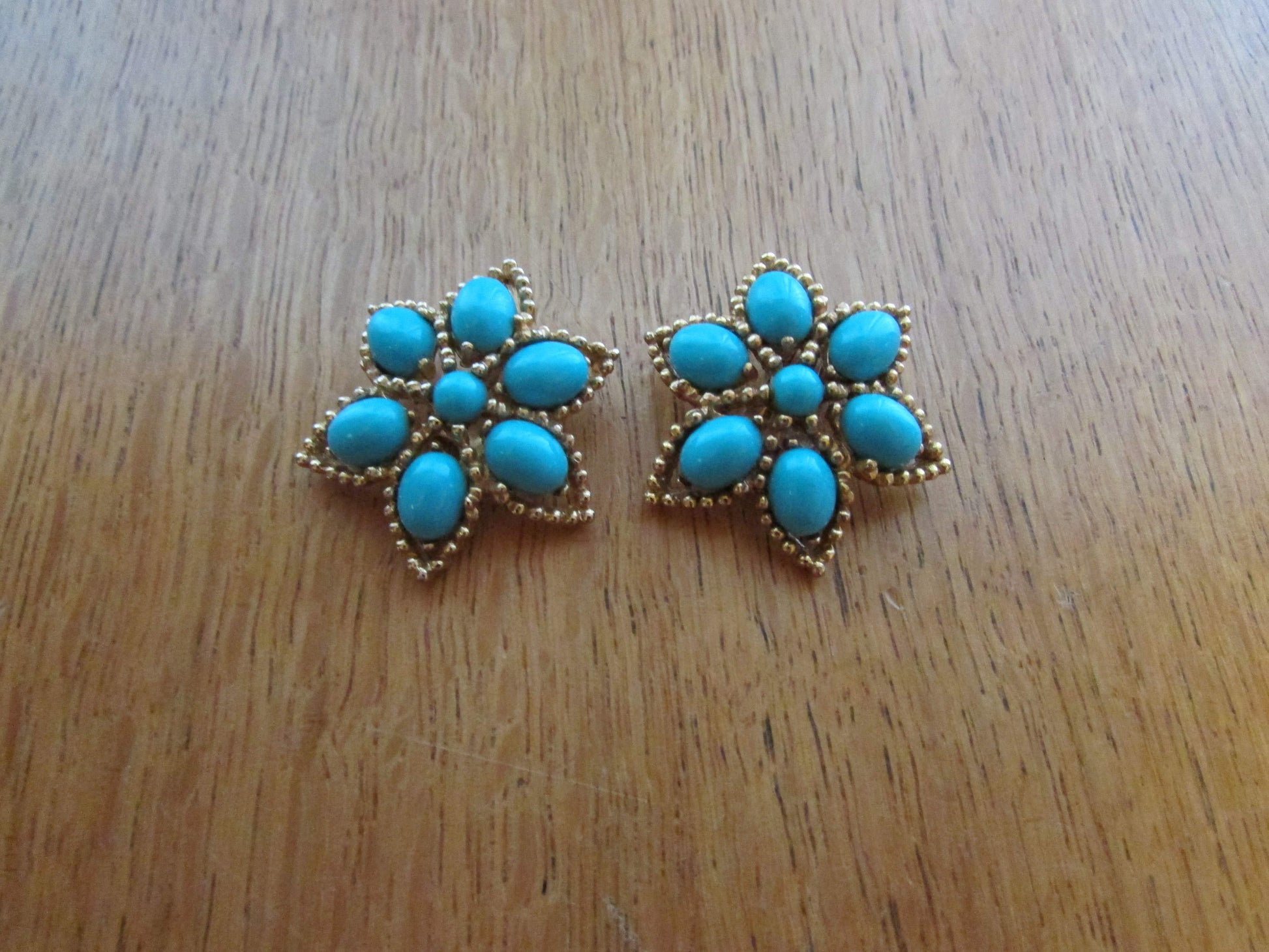 Large vintage gold-tone & turquoise plastic cabochon flower clip-on earrings