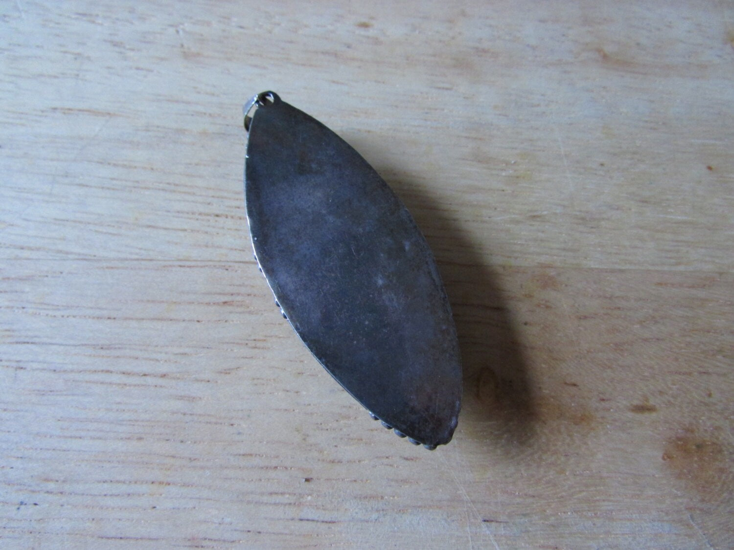 This striking vintage 5.5 cm long pendant features a large green Amazonite stone, beautifully set in silver-tone metal with intricate scroll detailing. Its unique blend of natural elegance and timeless design makes it a captivating accessory that enhances any outfit with a touch of sophistication. Perfect for those who appreciate distinctive, refined jewelry with an artisanal feel.