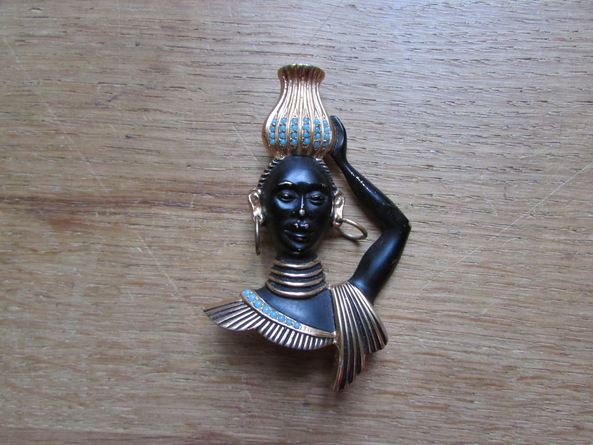 Mid-century blackamoor tribal bust brooch with turquoise seed bead accents