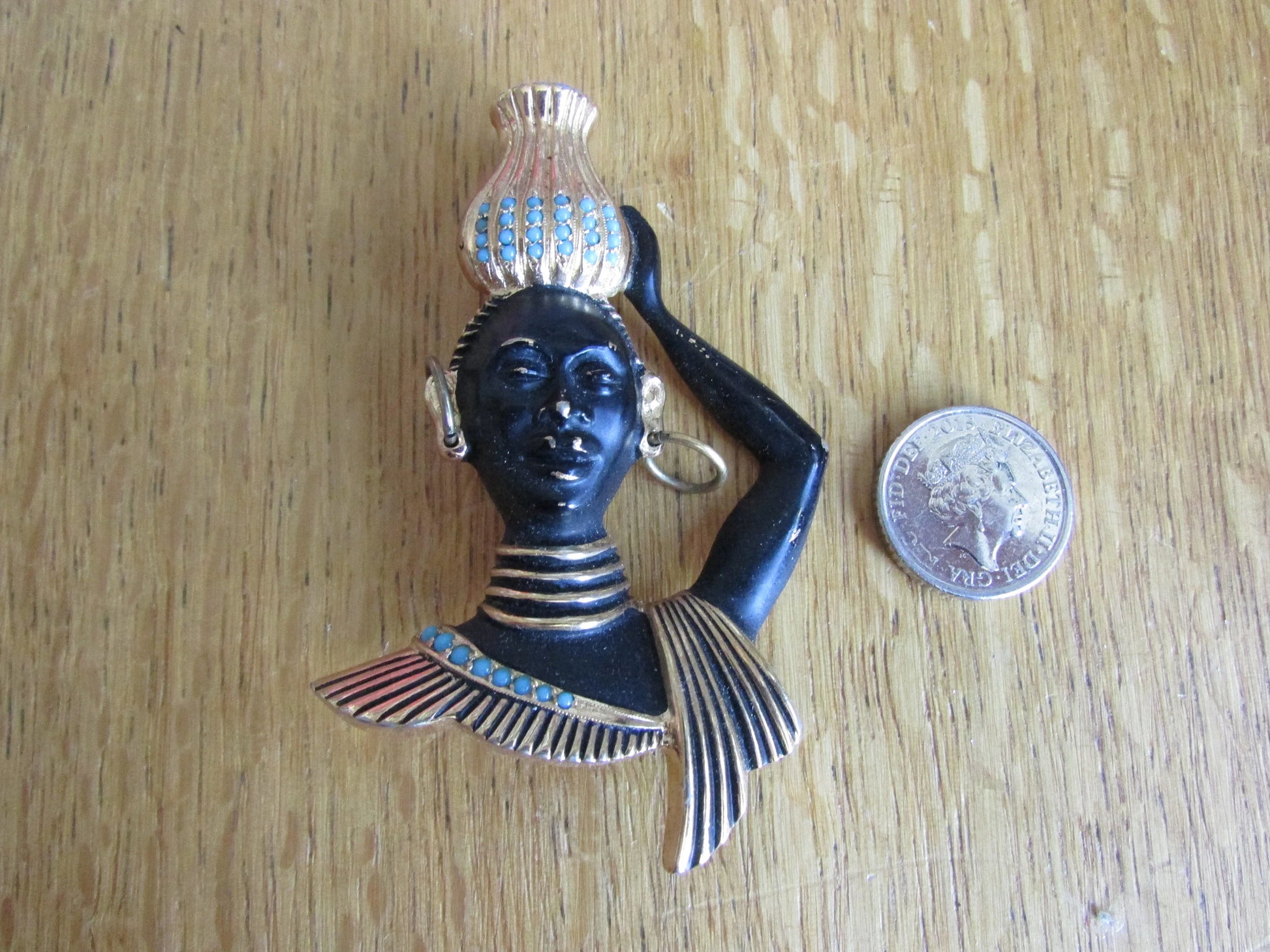 This striking mid-century blackamoor tribal bust brooch measures approximately 6.5cm high by 5cm wide, making it a bold but wearable statement piece. Accented with delicate turquoise seed beads, it adds a touch of cultural charm. Perfect for collectors or those seeking a unique accessory that blends vintage elegance with tribal artistry.