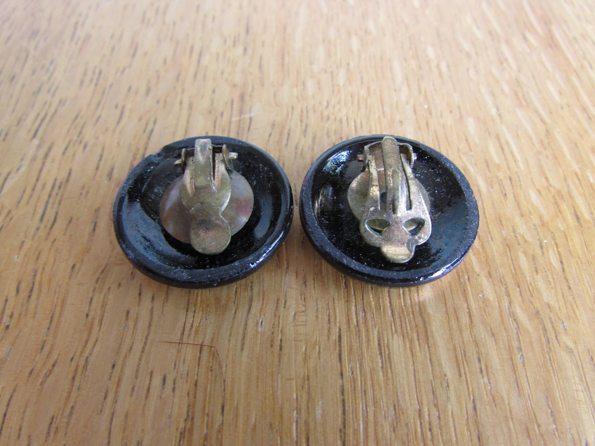 These mid-century bronze-toned plaid glass clip-on earrings add timeless elegance to any outfit. Measuring 2cm in diameter, their rounded design and warm bronze hues offer a classic vintage appeal. A tiny chip on the underside of one earring is not visible from the front, ensuring your style remains flawless. Perfect for those who appreciate unique, retro-inspired accessories without compromising on comfort or charm.