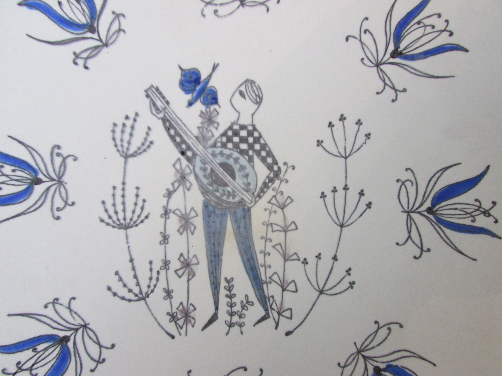 Mid-century Inger Waage for Stavangerflint, Norway, hand painted triangular plate, Man with Mandolin
