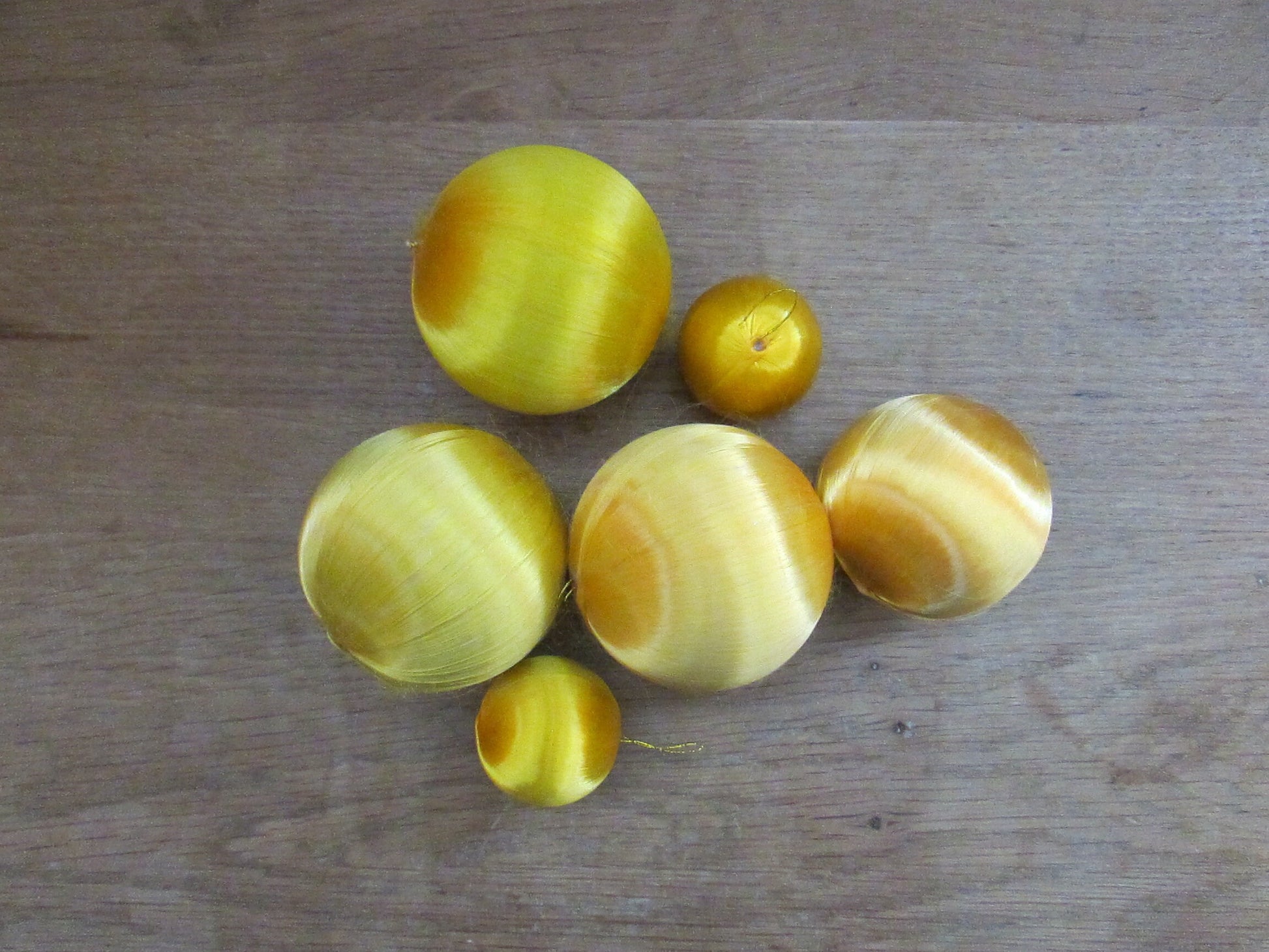 Mid-century jewel-coloured spun satin/silk bauble bundle, including apples with gold leaves
