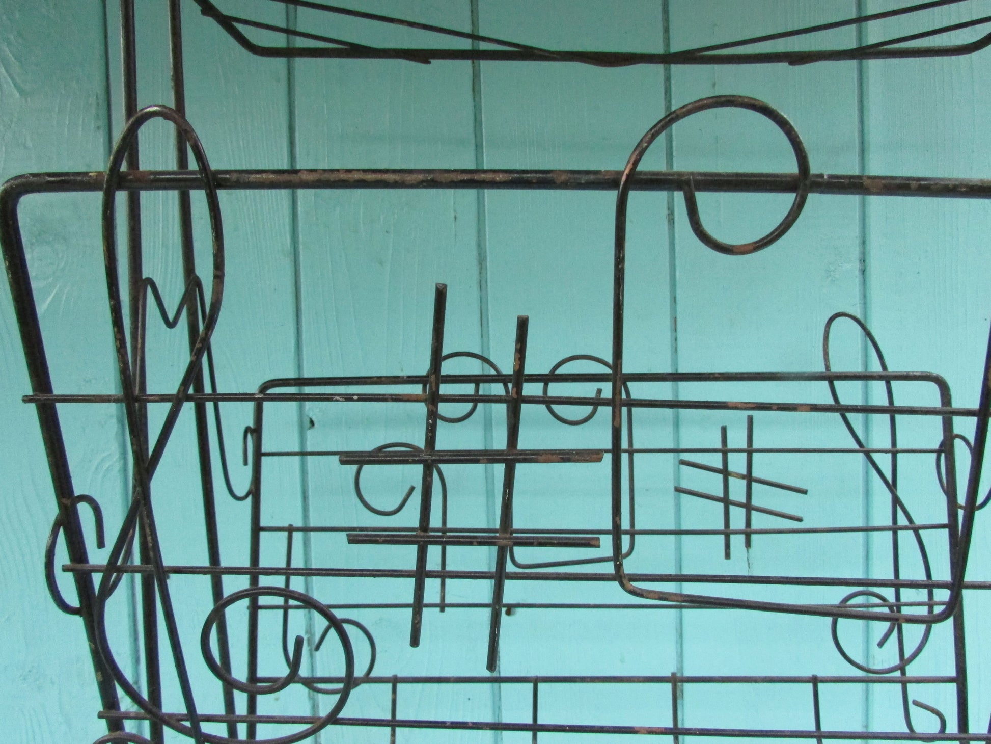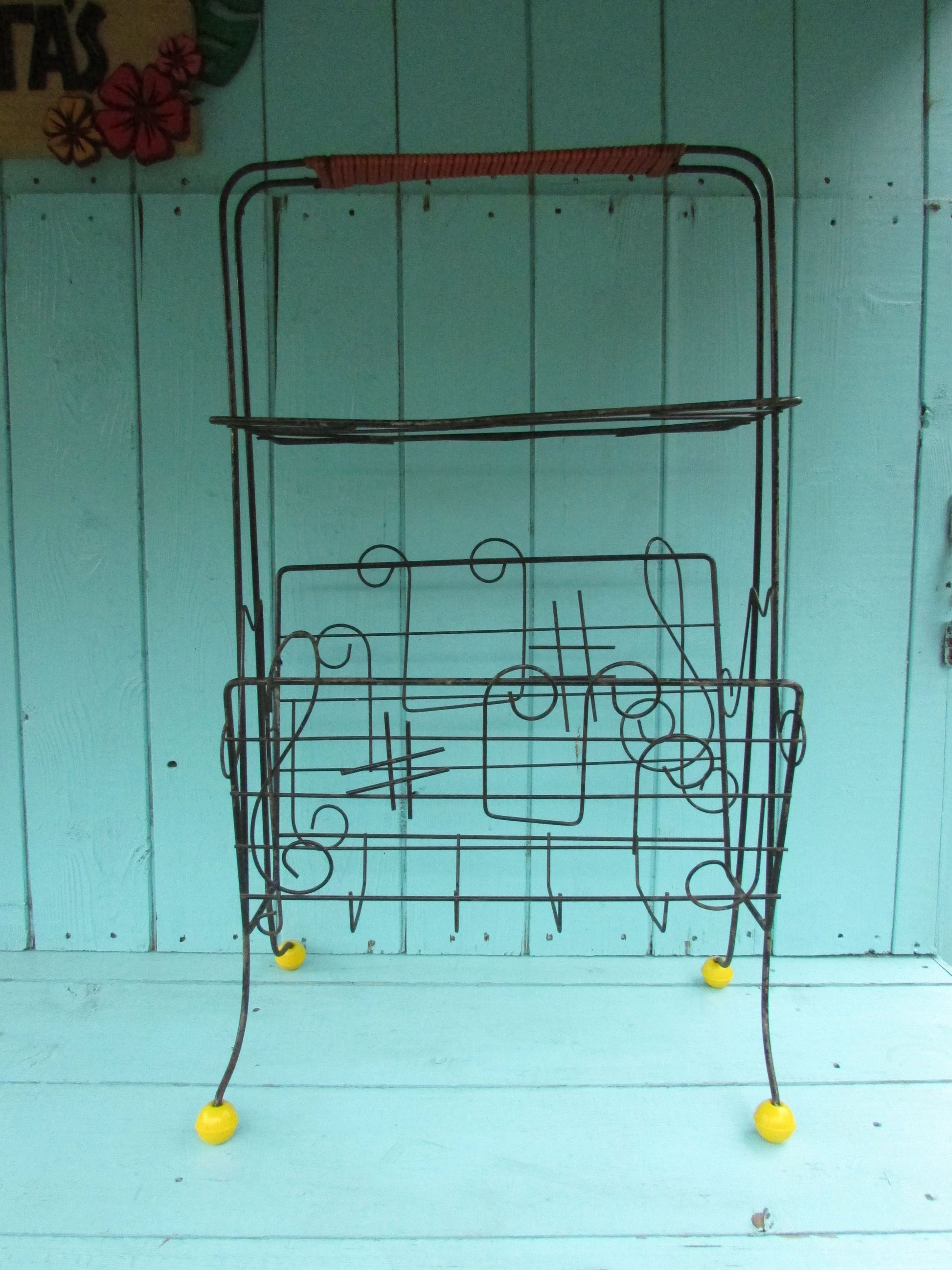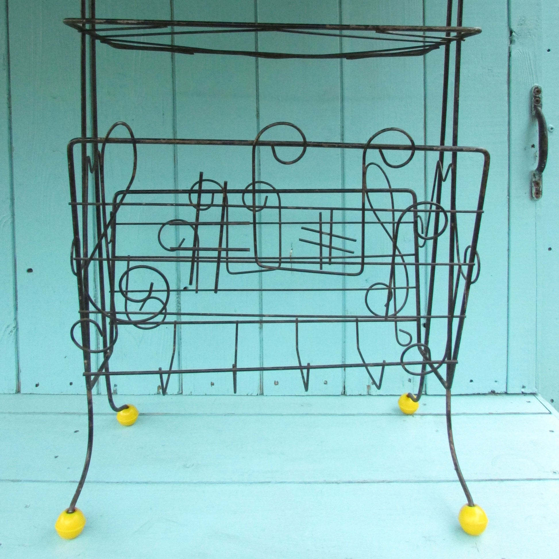 Mid-century metal atomic music note magazine rack with woven handle and ball feet detail