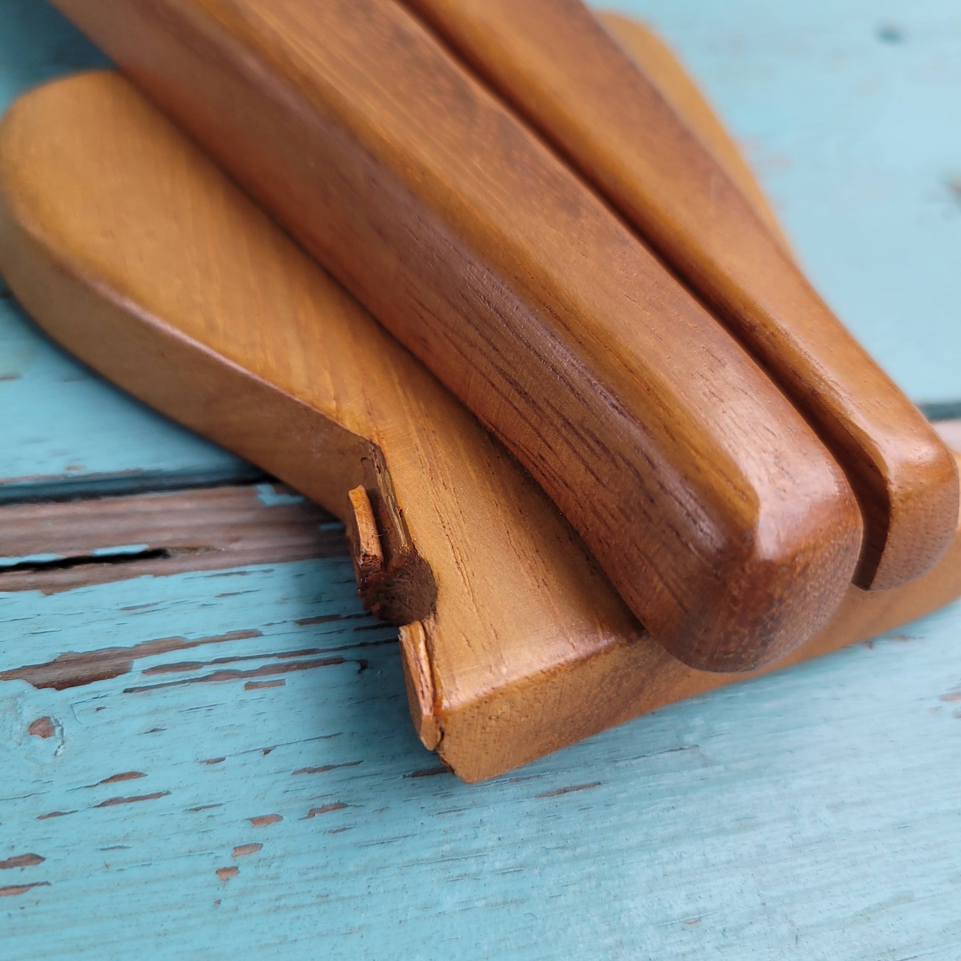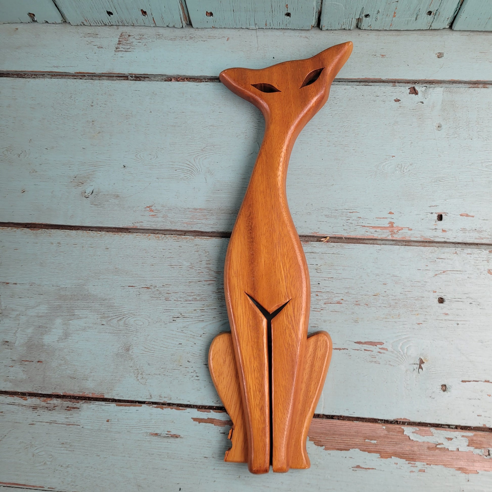 This mid-century monkeypod wooden cat plaque measures about 34 cm in height and highlights classic craftsmanship. While one paw shows minor damage and the tail might be absent, these imperfections enhance its vintage appeal. Ideal for collectors and admirers, this unique piece adds genuine mid-century character to any setting.