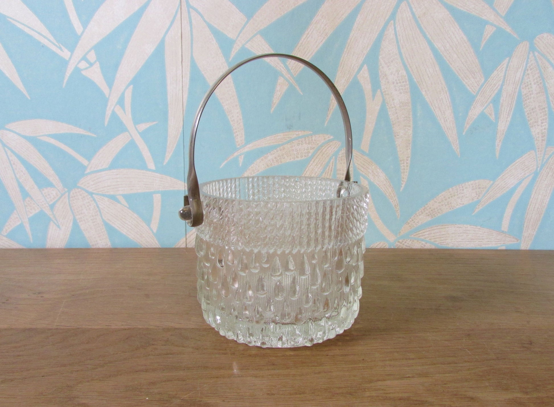This elegant mid-century ice bucket features a distinctive tear and rain drop textured glass design, adding a touch of vintage charm to any setting. Measuring 10cm high (excluding handle) with a 13cm diameter, it’s perfectly sized for chilling your favorite beverages. Its unique texture not only enhances grip but also creates a captivating visual effect, making it a stylish and functional addition to your bar or dining table. Elevate your entertaining experience with this timeless piece that blends practicality with classic mid-century style.
