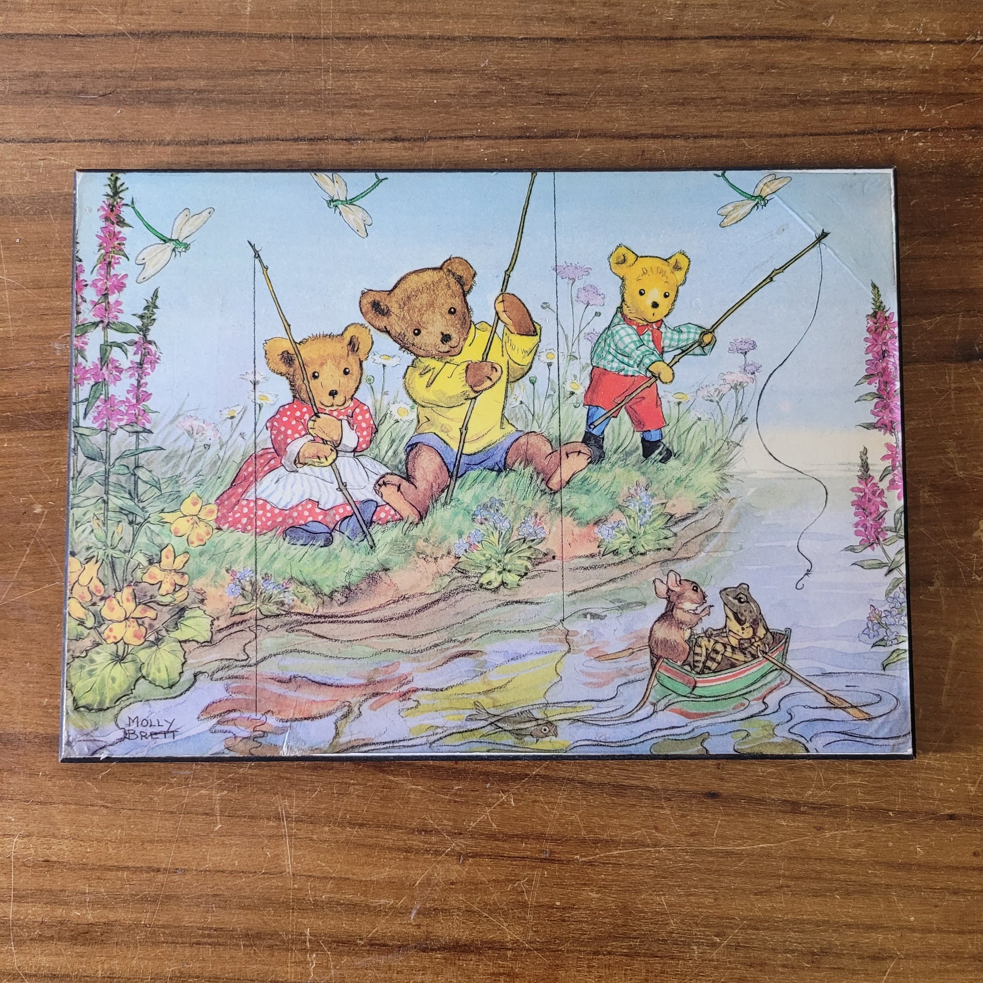 Pair of vintage Molly Brett prints on hardboard - Teddies Fishing, & Teddy Bears and Blackberries