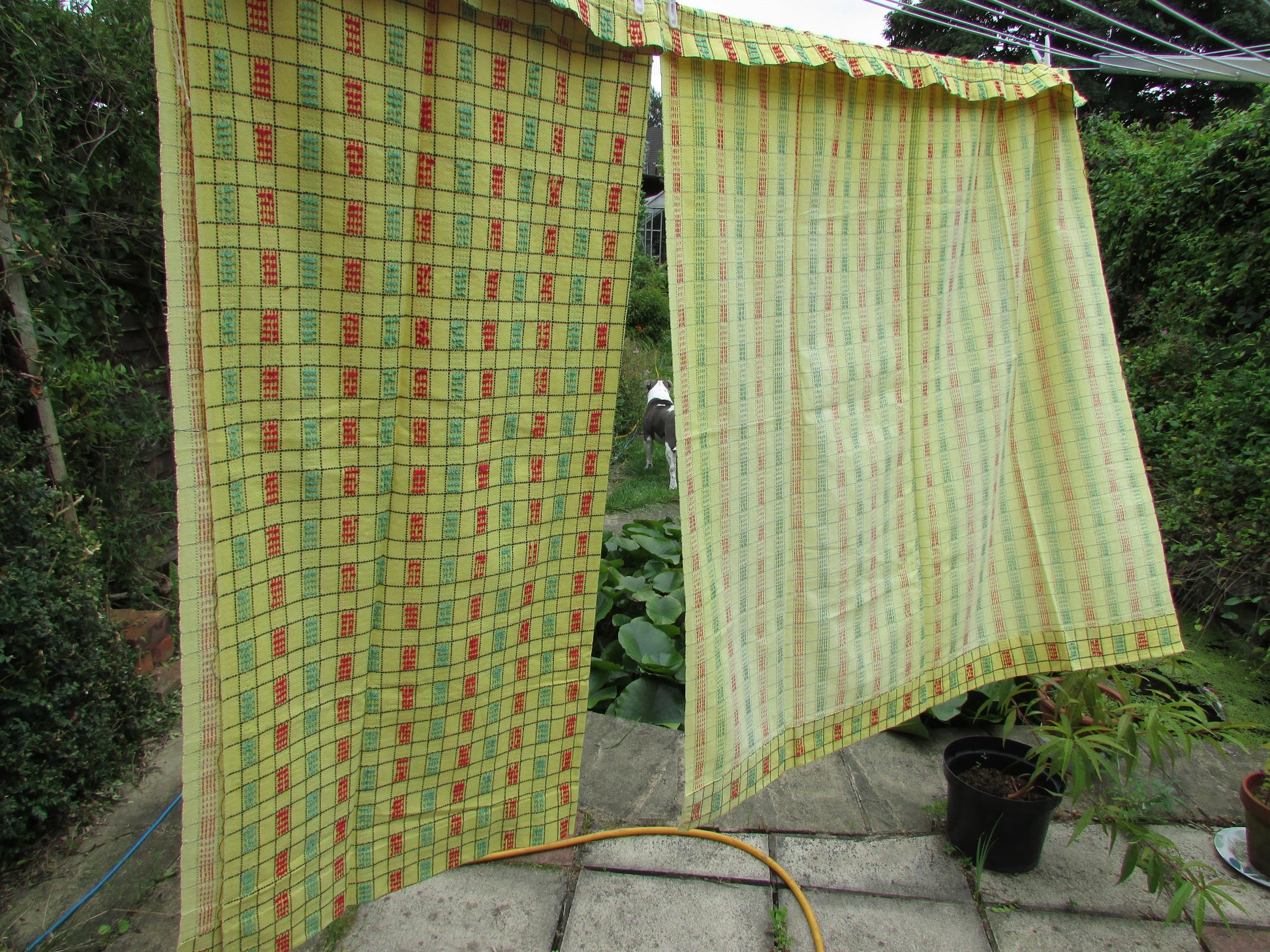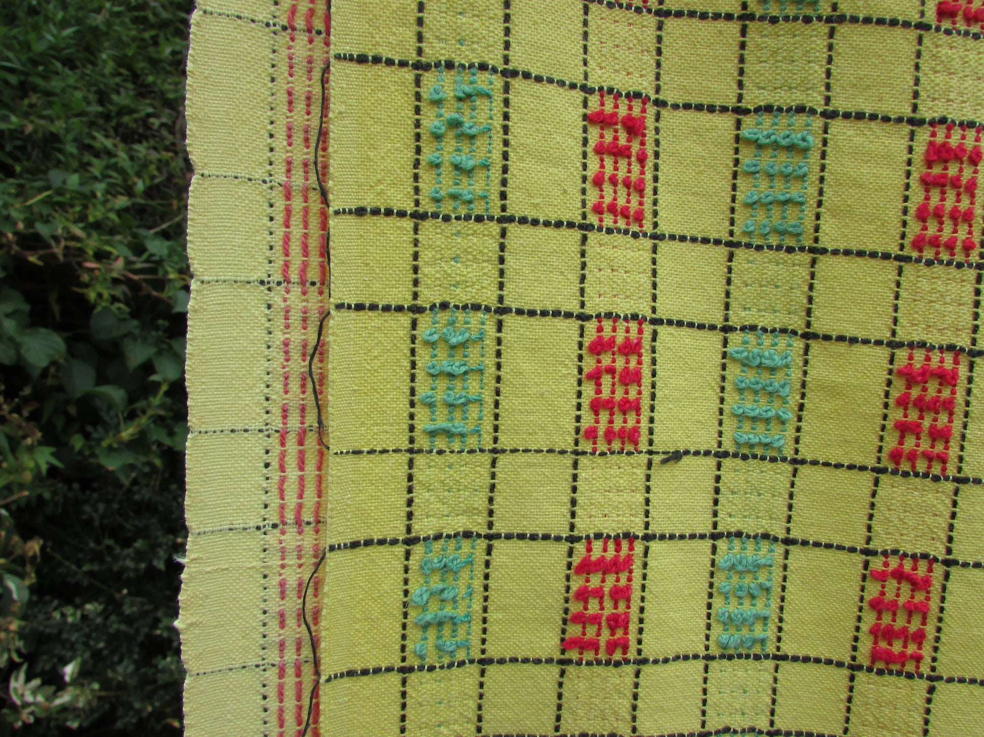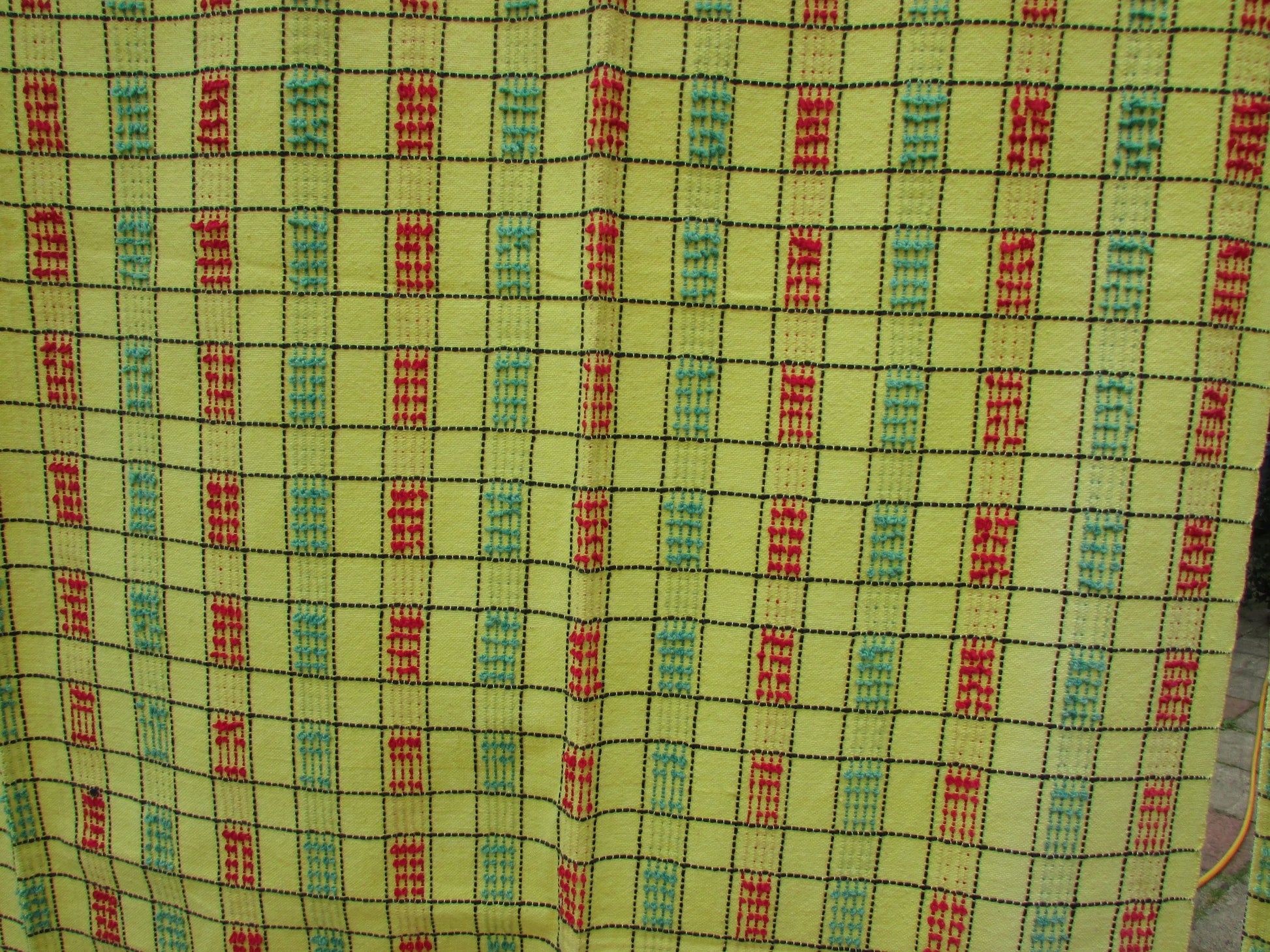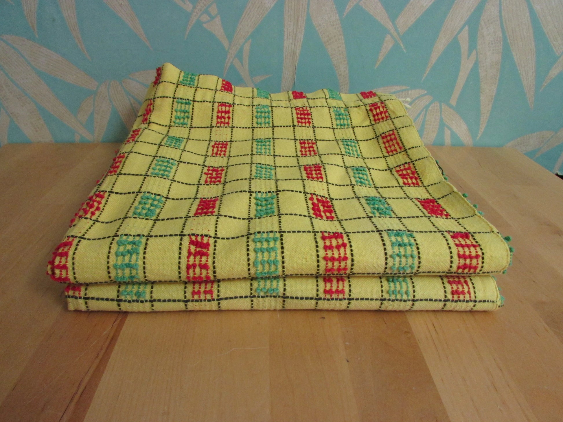 Pair of vintage yellow, green & red checked embroidered barkcloth curtains, 42" x 47"