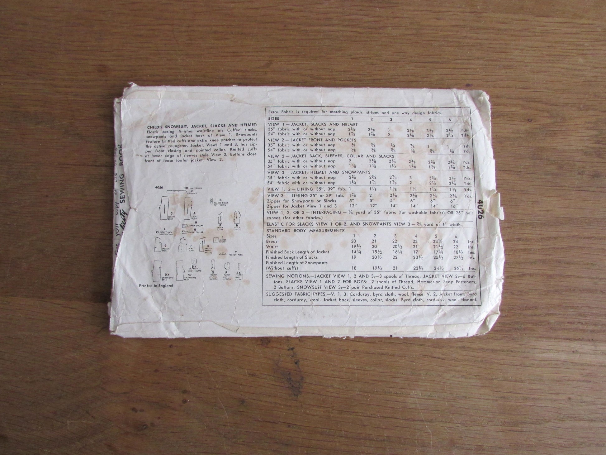 Part cut 1950s Simplicity 4026 sewing pattern for child's snowsuit, jacket, slacks & helmet, size 6 (see description below)