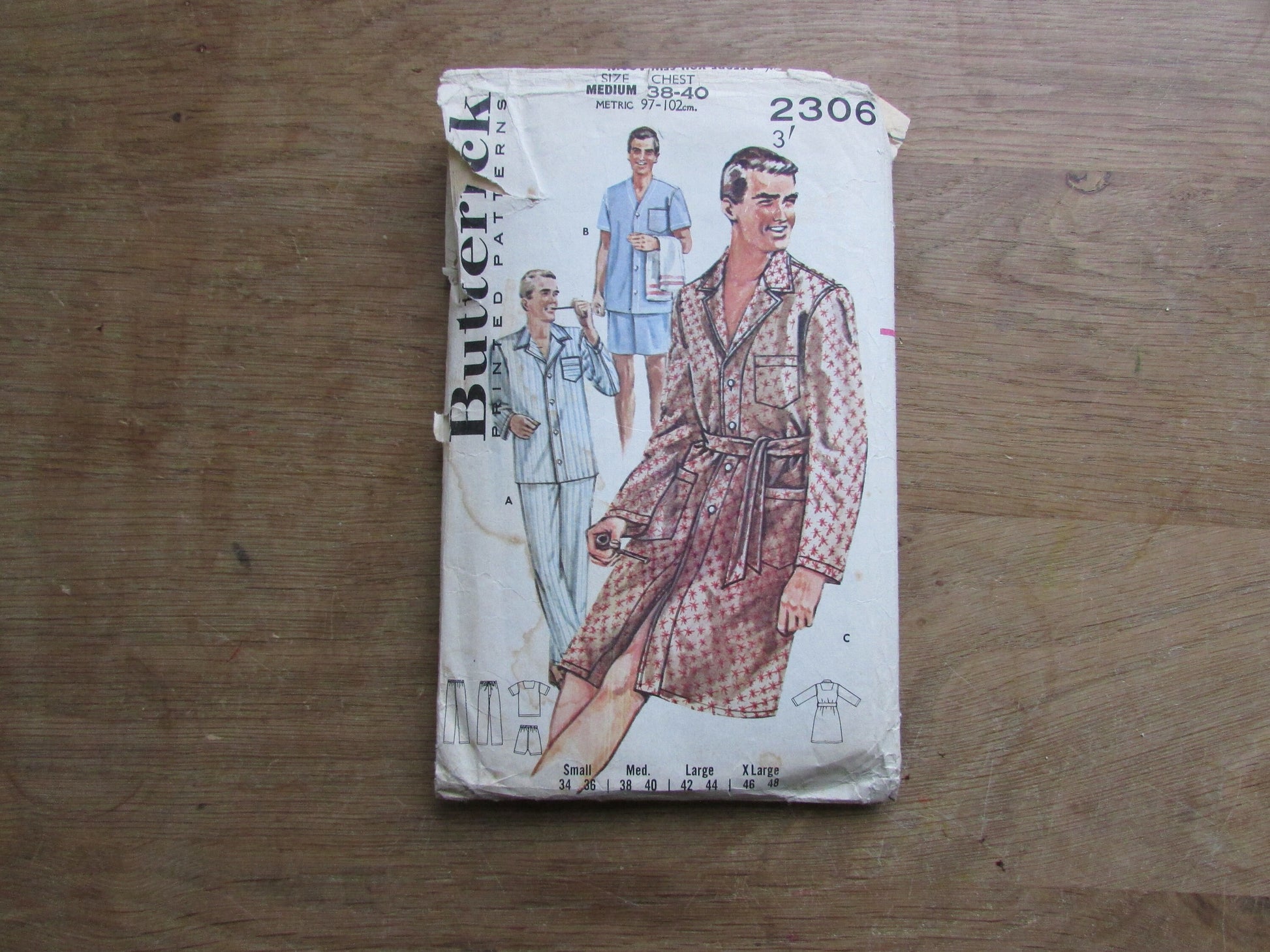 Part cut 1960s Butterick 2306 sewing pattern for men's pajamas & sleep coat, size M (complete)