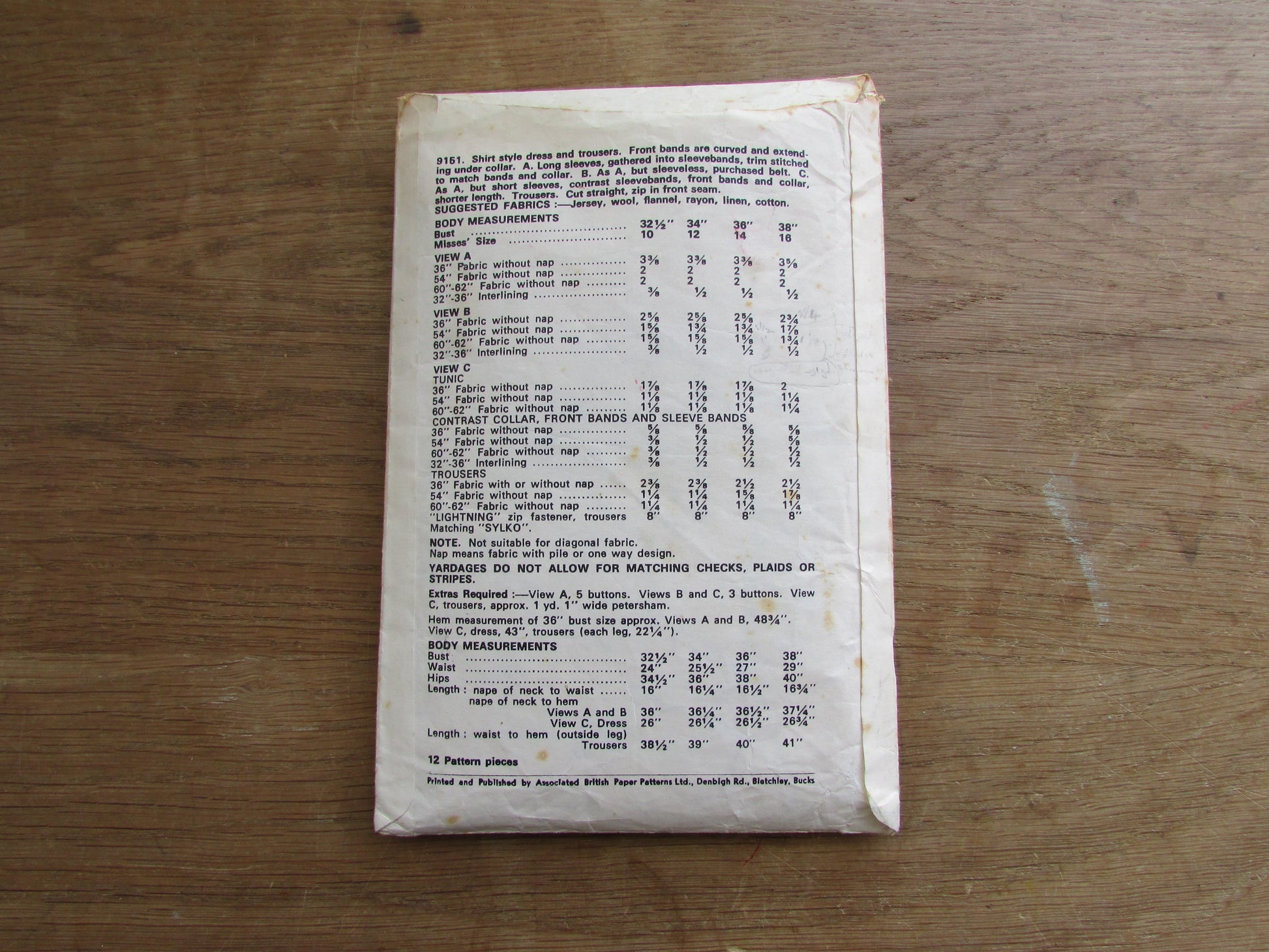 Part cut 1960s le roy Weldons 9151 sewing pattern for misses' shirt style dress & trousers, size 16 (complete)