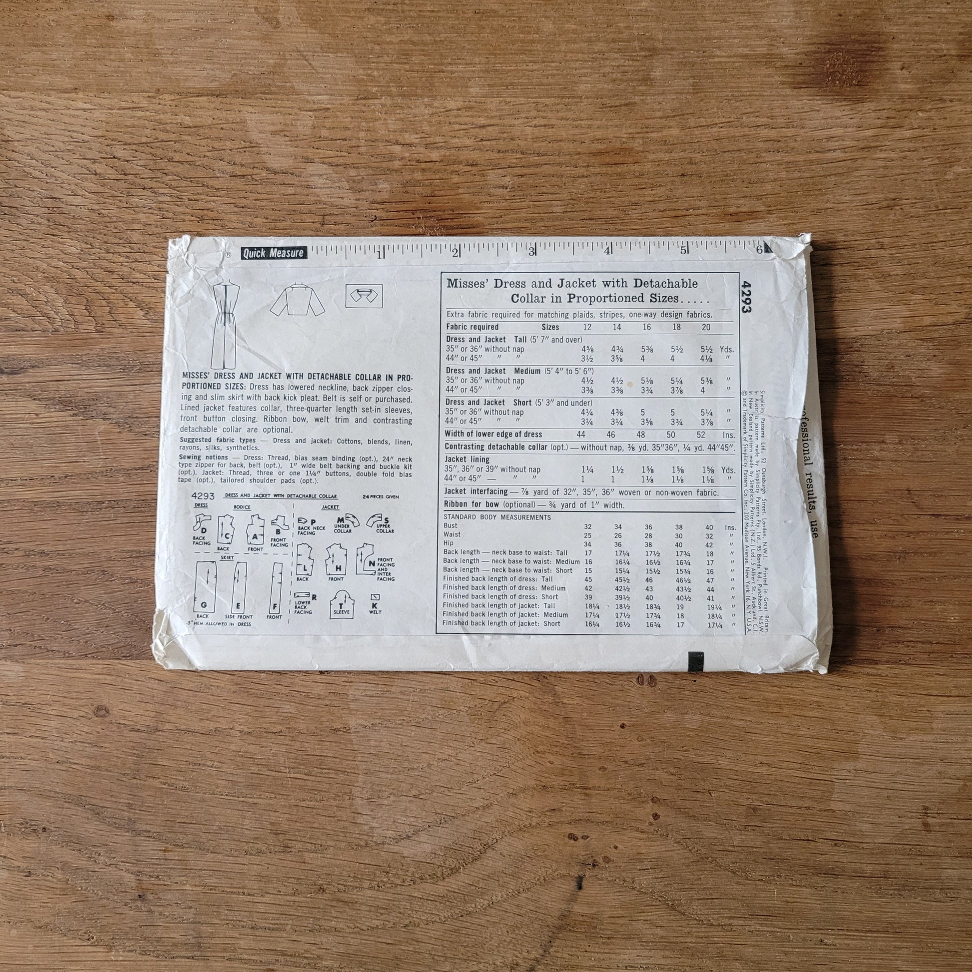 Part cut 1960s Simplicity 4293 sewing pattern for misses' dress & jacket with detachable collar, size 16 (complete)