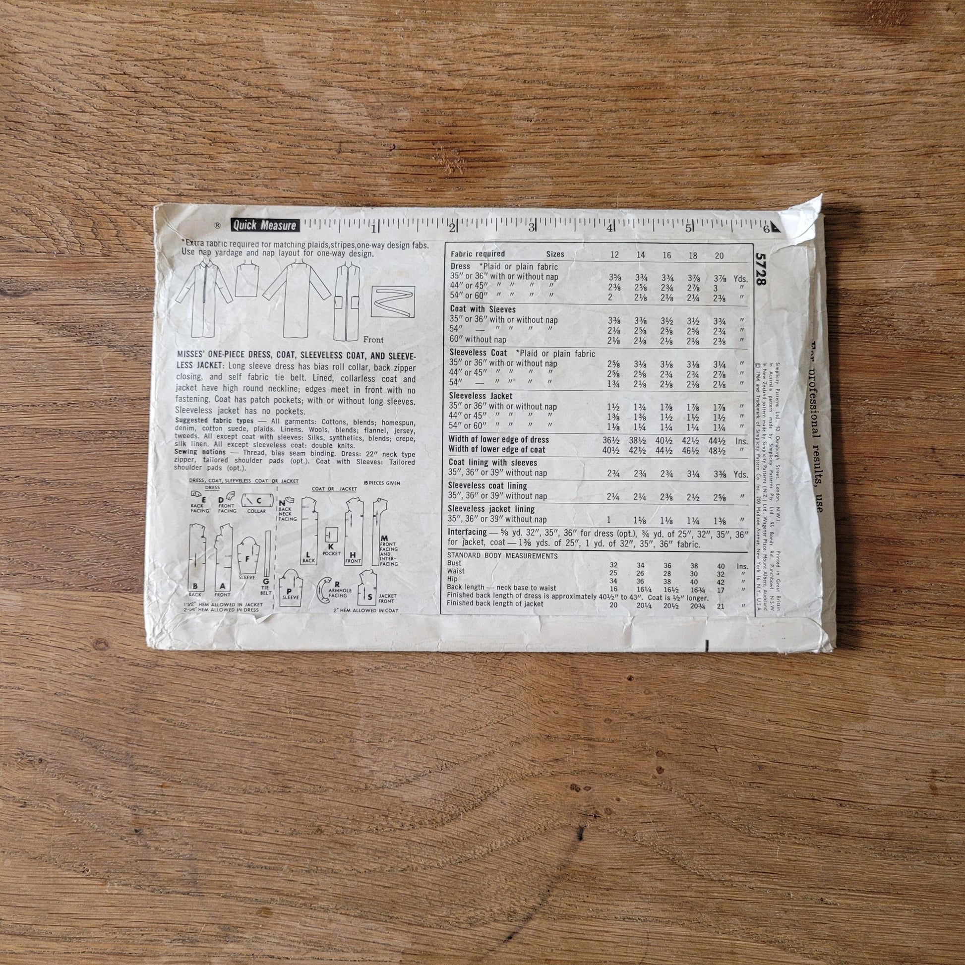Part cut 1964 Simplicity 5728 sewing pattern for misses' one-piece dress, sleeveless coat, & sleeveless jacket, size 14 (complete)