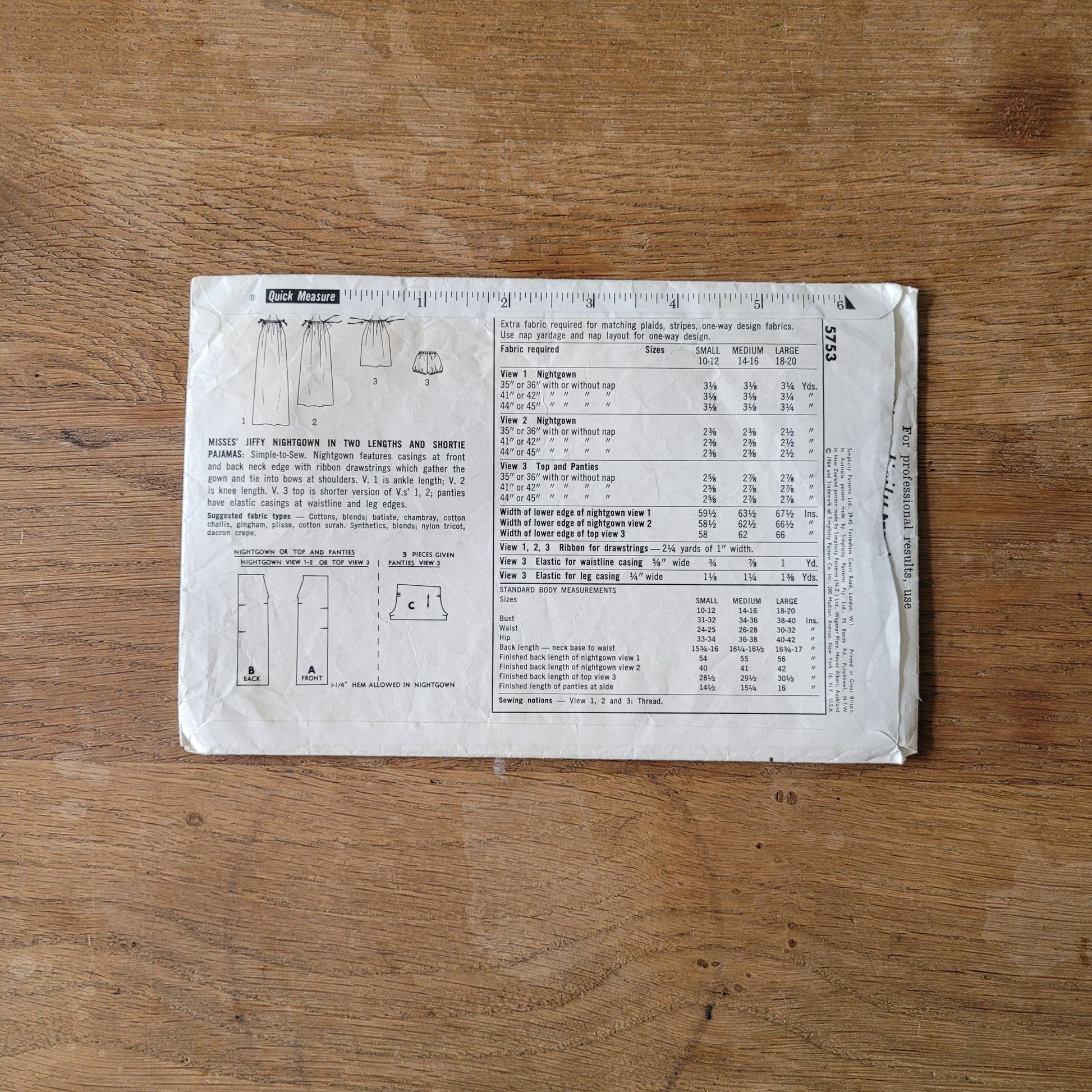 Part cut 1964 Simplicity 5753 sewing pattern for jiffy nightgown in two lengths, and shortie pajamas, size M 14-16 (complete)