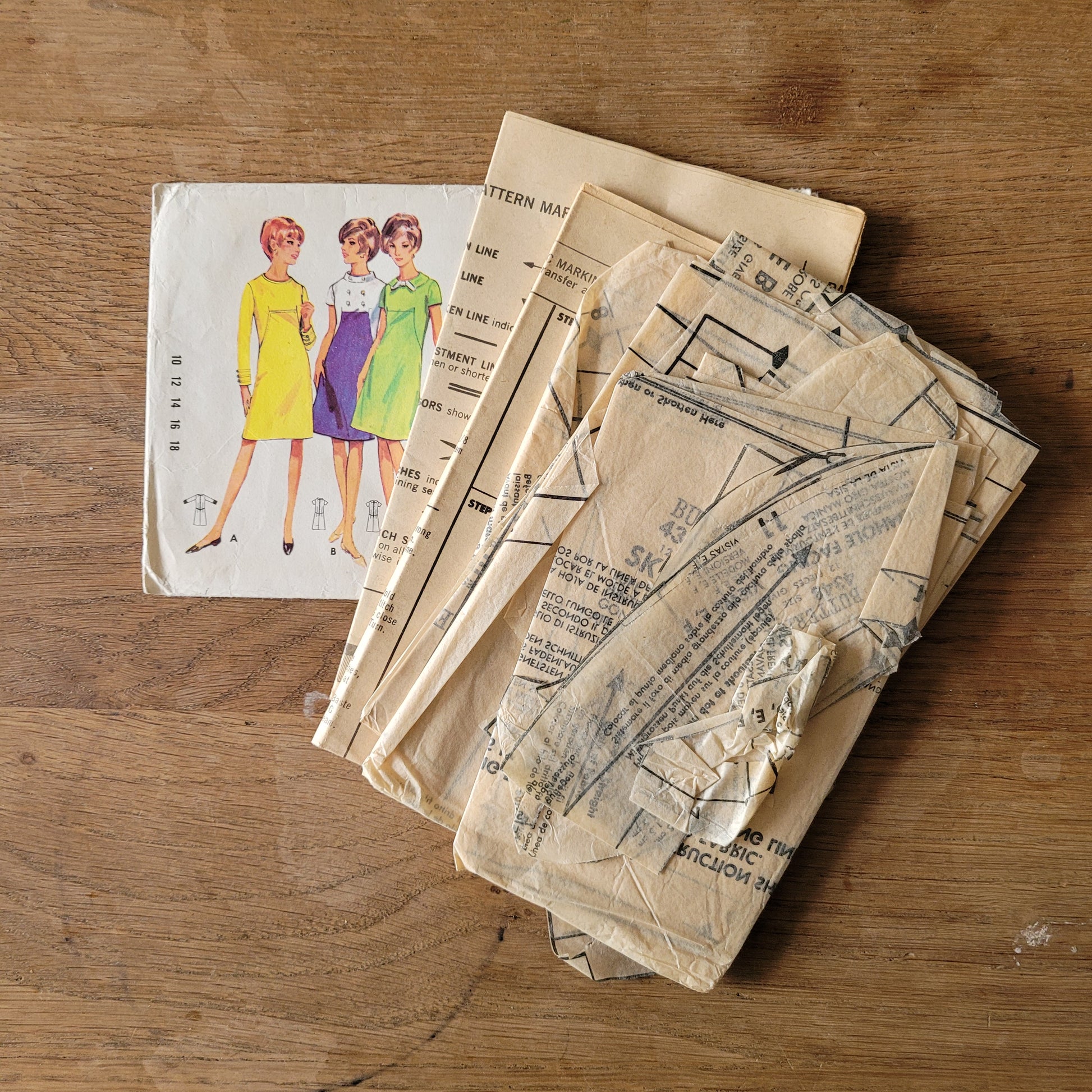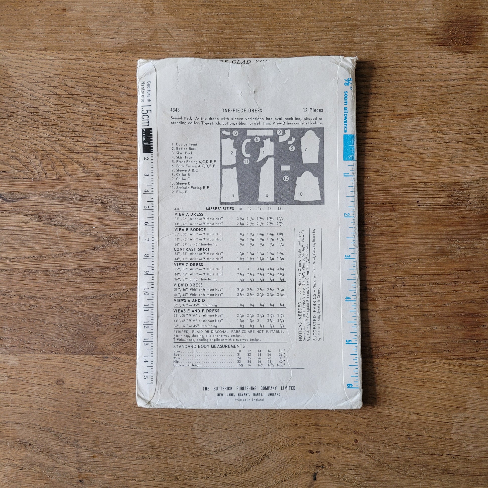 Part cut 1967 Butterick 4348 sewing pattern for one-piece A-line dress, size 16 (complete)