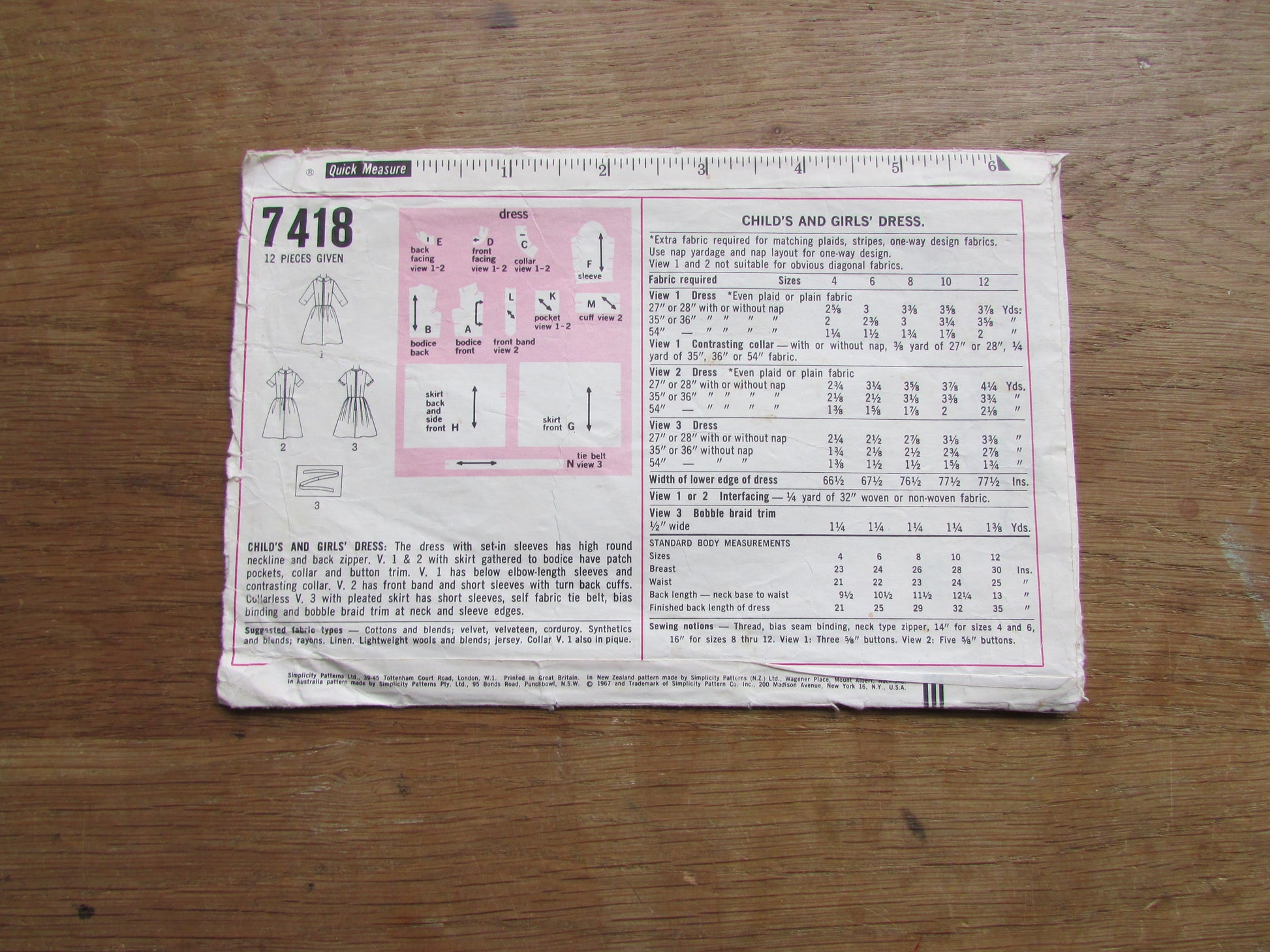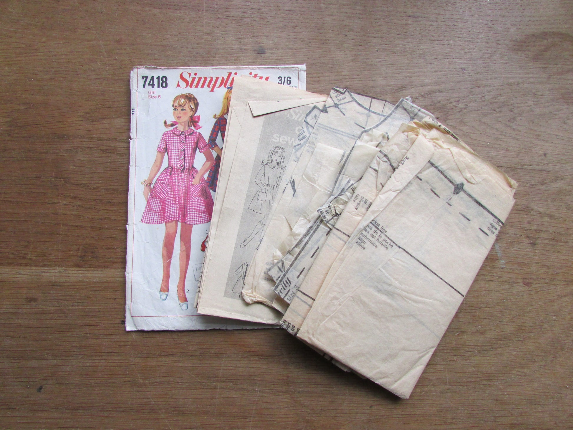 Part cut 1967 Simplicity 7418 sewing pattern for child's & girls' dress, size 8 (complete, see description below)