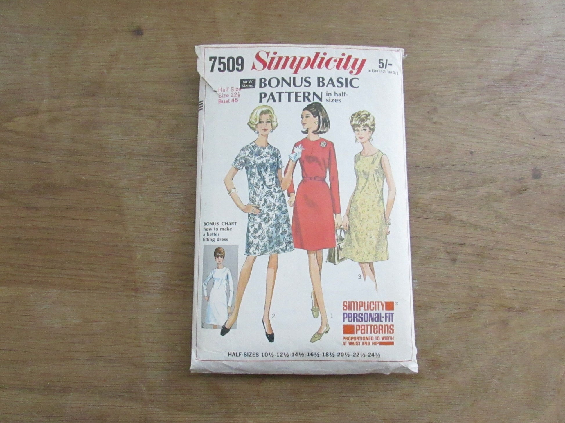 Part cut 1968 Simplicity 7509 sewing pattern for bonus basic dress in half-sizes, size 22.5 (complete)